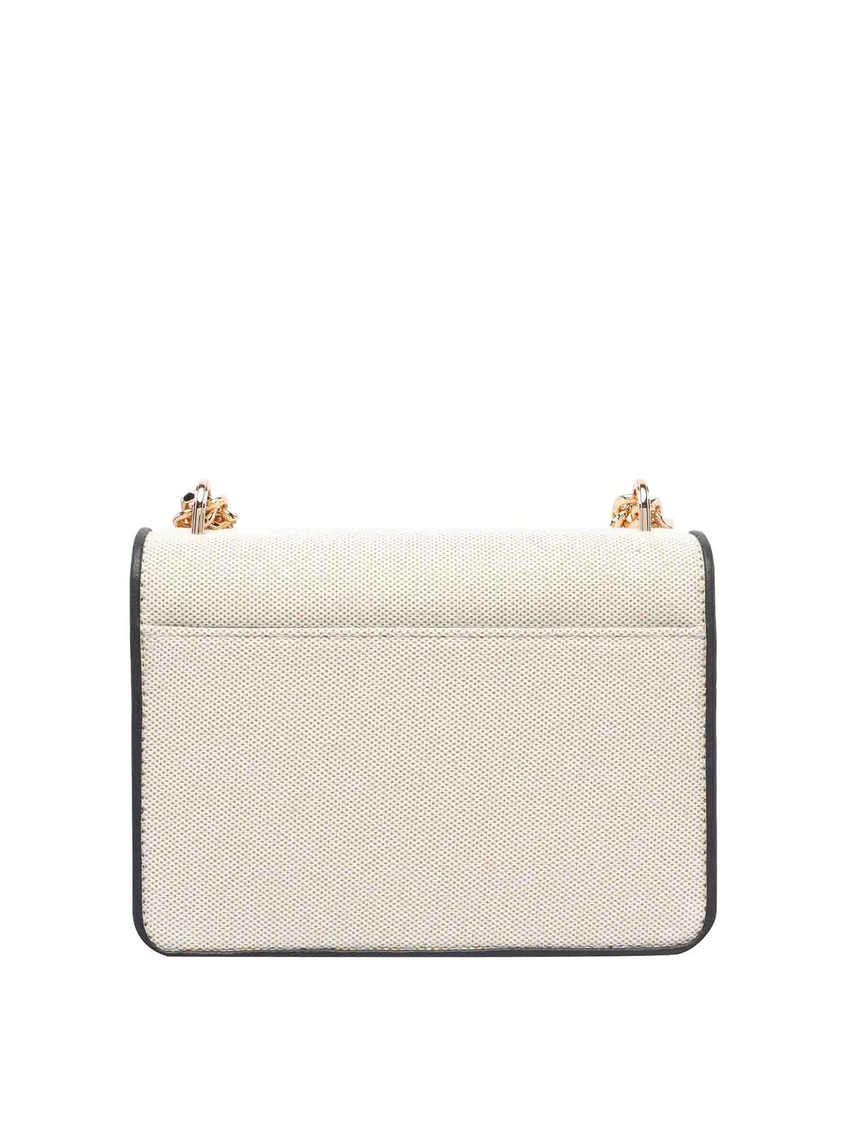 白と黒のクロスボディバッグファスナー付きマグネットポケット、オープンポケット1つ、背面にオープンポケット1つ、調節可能で取り外し可能なショルダーストラップのロゴ