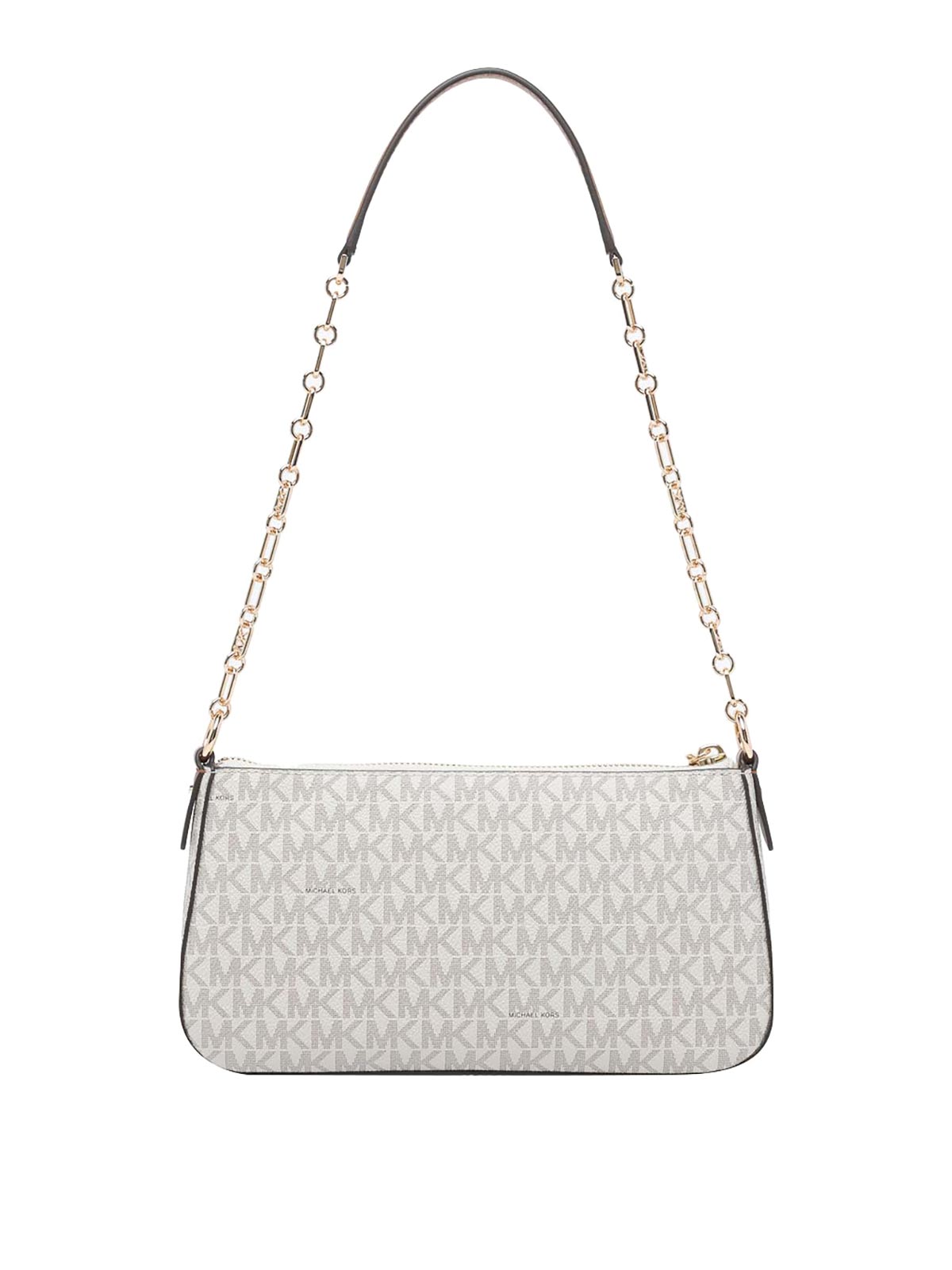 マイケル・マイケル・ベージュミディアムロゴエンパイアポシェット、ジップクロージャー、ショルダーストラップ、ロゴオールオーバー