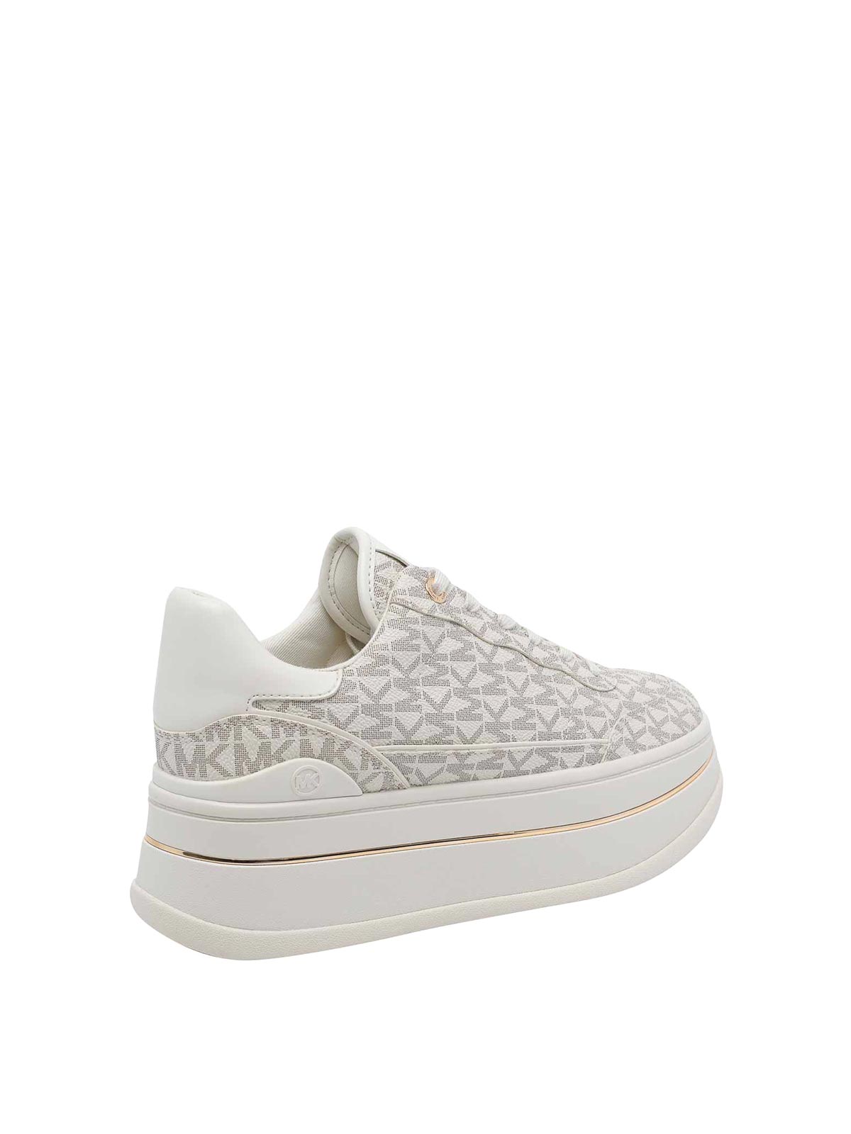 マイケル・マイケル・コースベージュ・ヘイズ・スニーカー、ラウンドトゥ、全面にロゴ、プラットフォームモデル