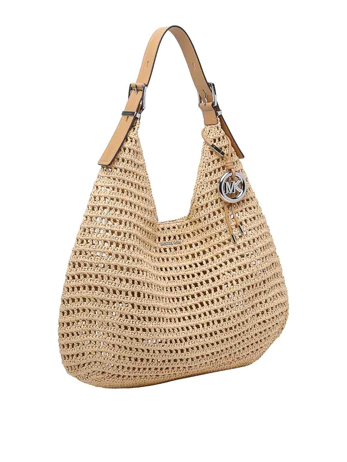 Michael Michael Kors ベージュノリータホーボーバッグ、マグネットクロージャー、取り外し可能で調整可能なストラップ、ラフィアモデル