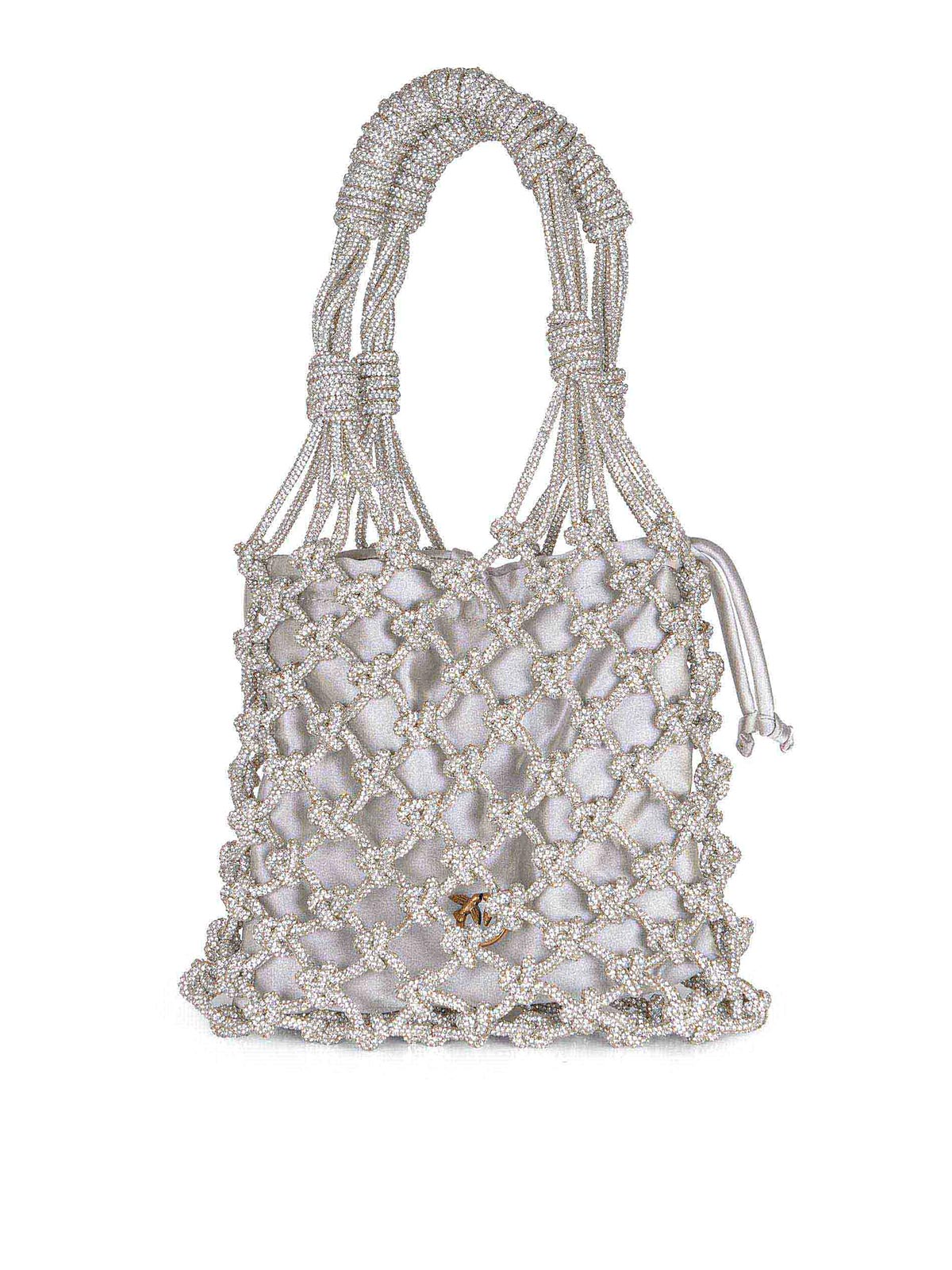 シルバーカラーのポリエステル製Pinkoミニクリスタルバッグ。バケットスタイル。トーン・オン・トーンのラインストーンで覆われたメッシュ。ダブルハンドル。ゴールドのラブバードのロゴが入ったトーン・オン・トーンの内側サテンポーチ。ポリエステル100%。