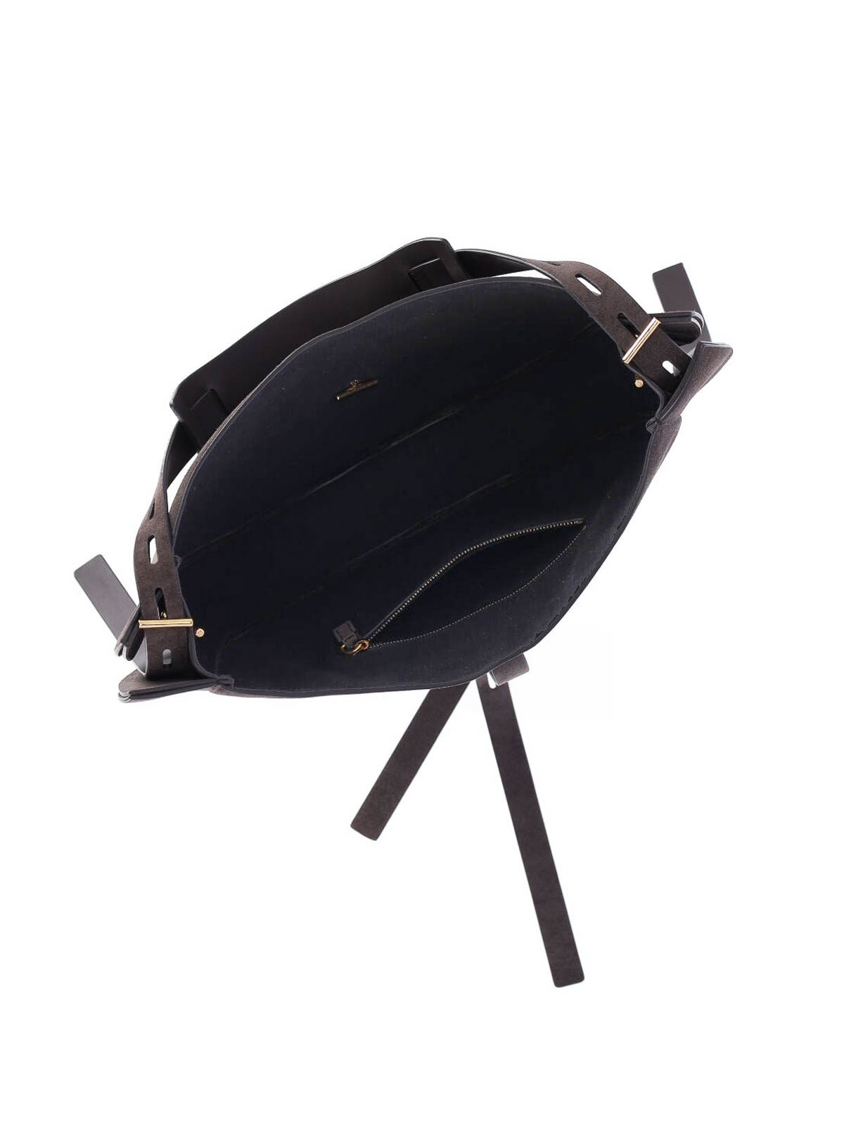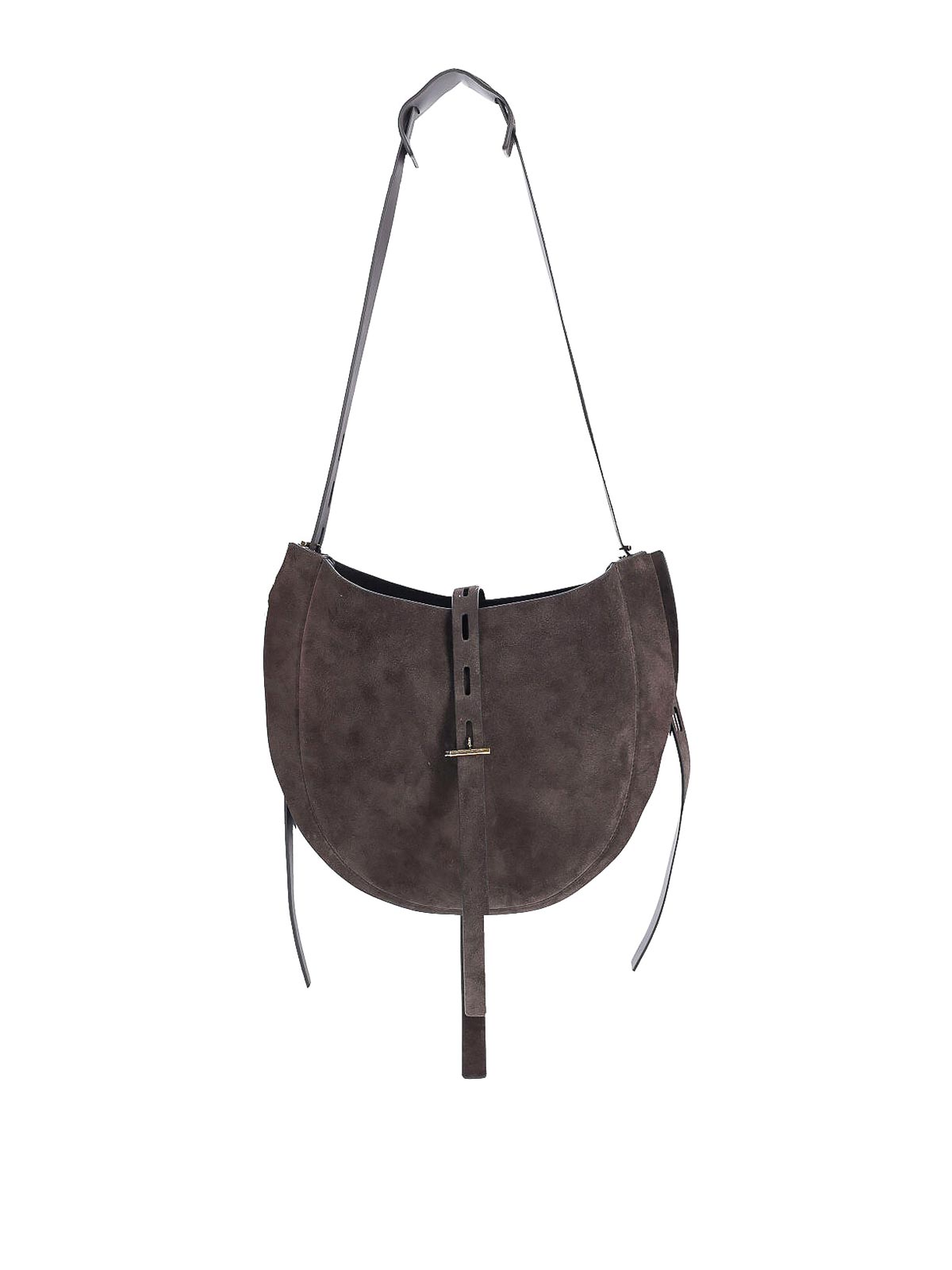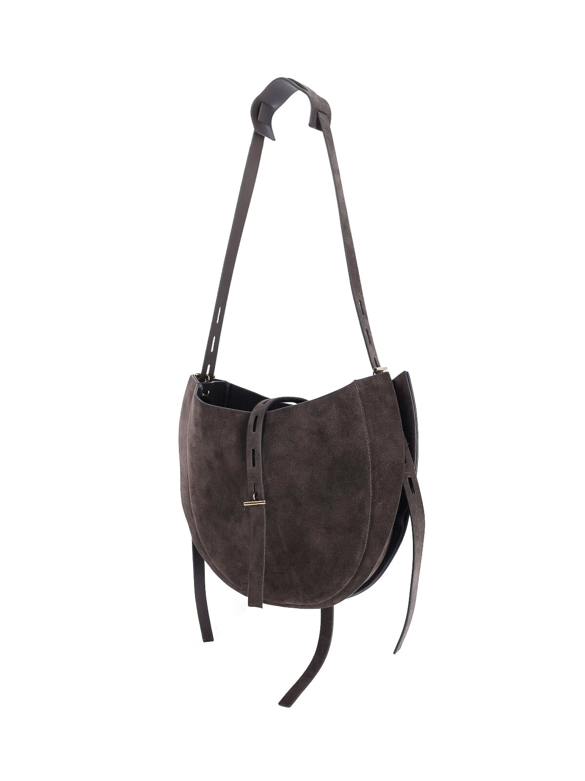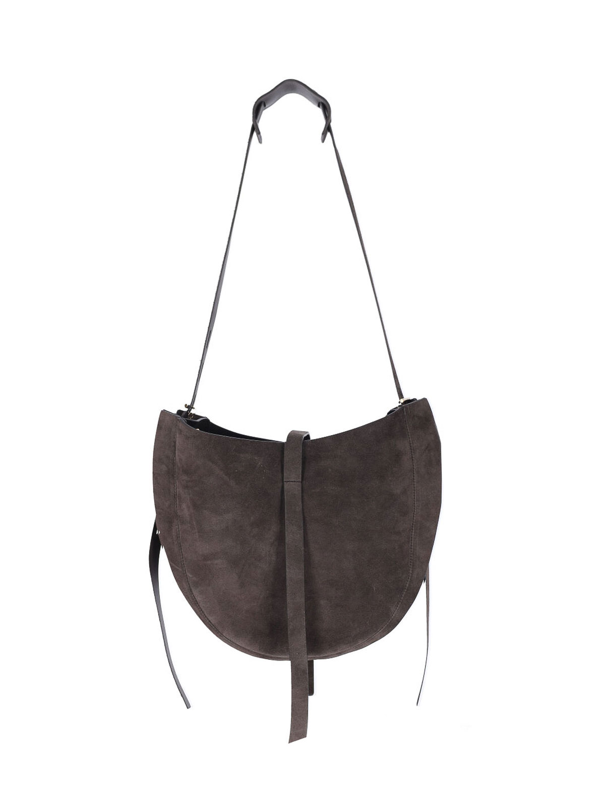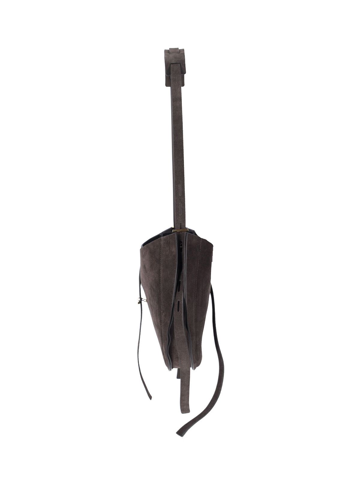 リズ・ホーボーのスモールバッグミノボッシ、ブラウンスエード製、調節可能なショルダーストラップ、調節可能なバックル付きストラップクロージャー、サイドレース、内側にファスナーポケット、メインコンパートメント。