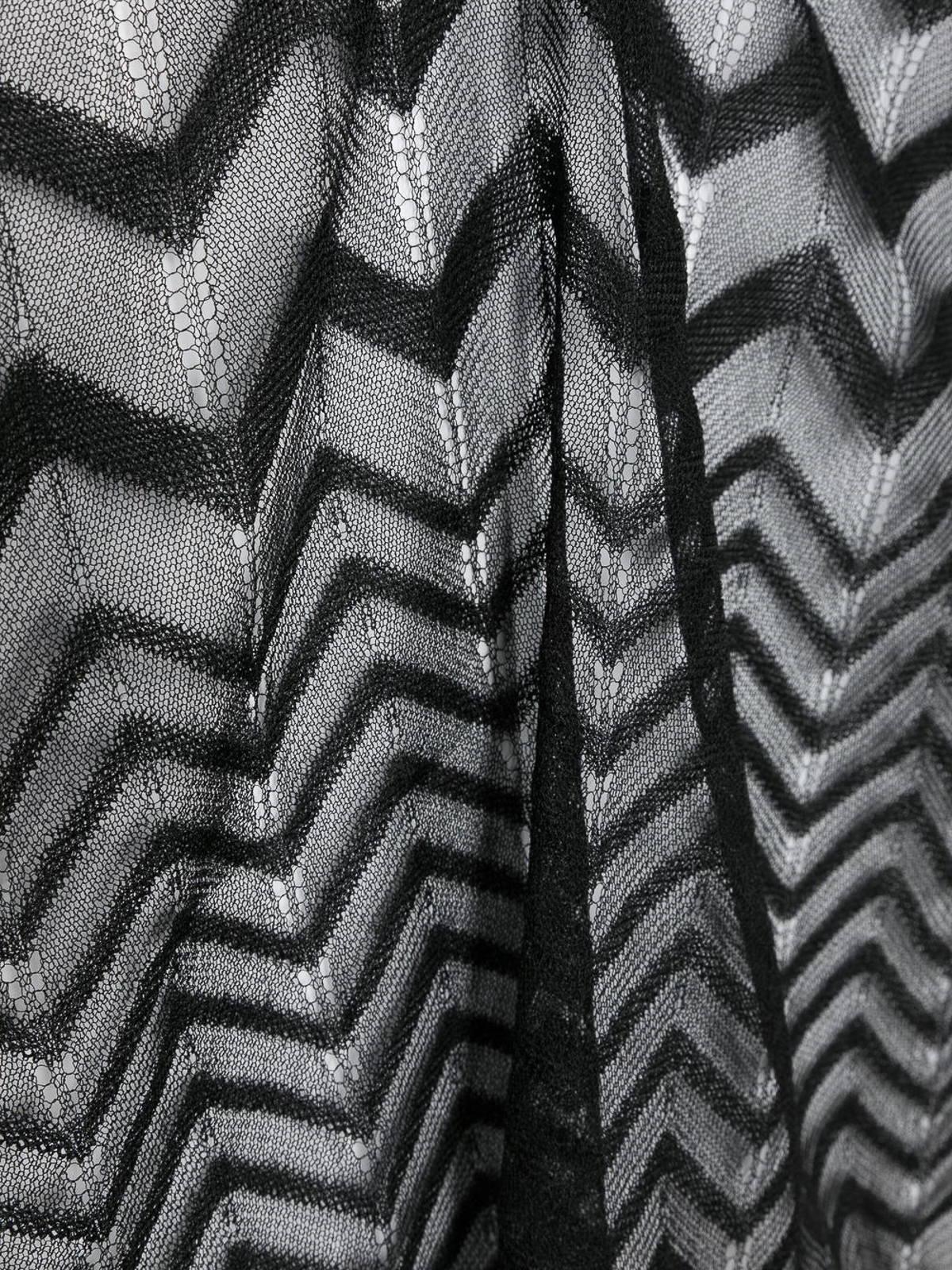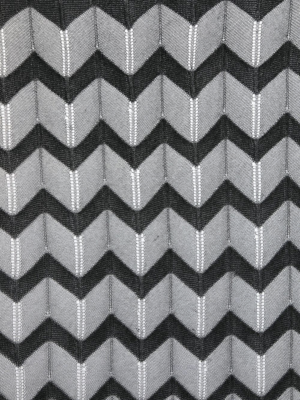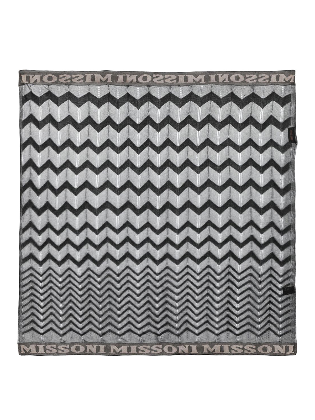 missoniのジグザグ織りスカーフ。ブラック/グレー、シグネチャーのジグザグ織りデザイン、ロゴプリントエッジ、スクエアシェイプが特徴です。
