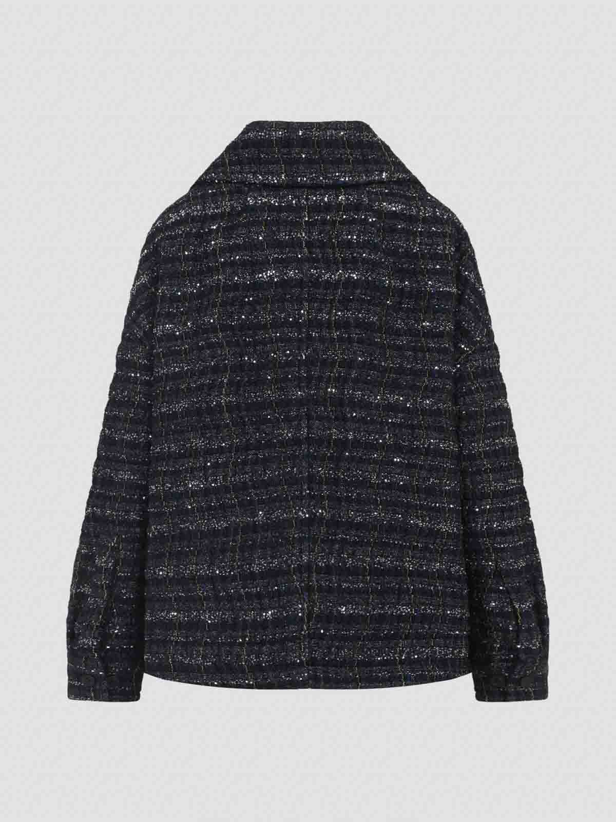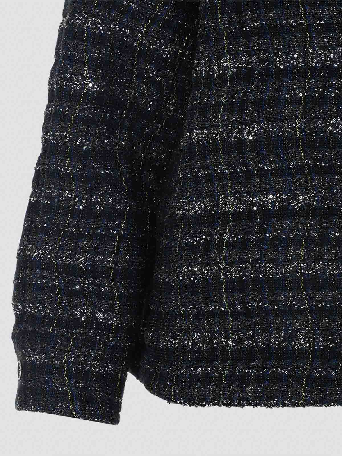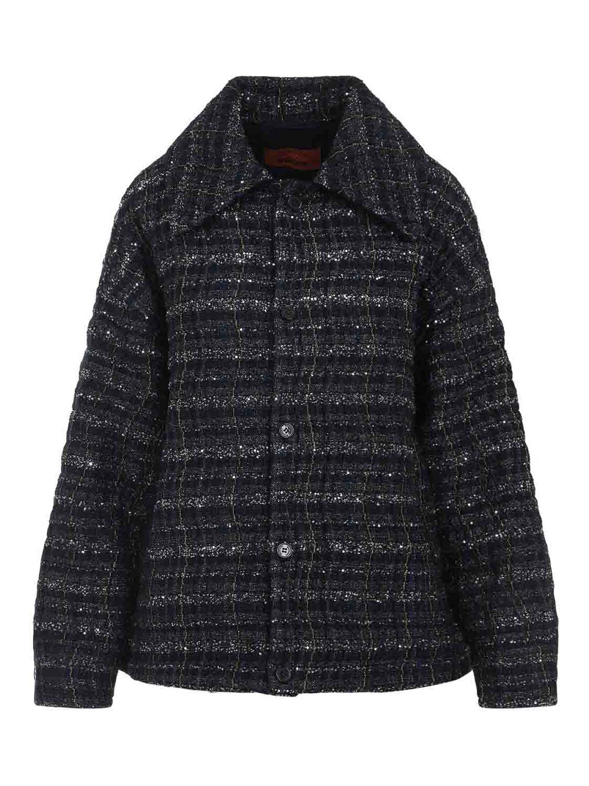 Missoni ブラックオーバーシャツ。ビスコース、ポリアミド、メタリック、ウール、コットン、ポリエステルのブレンドで作られています。ポインテッドカラー、フロントボタン留め、サイドポケット、ドロップショルダー、ボタン付きカフス、ストレートヘム。全体に黒と青のチェック柄、スパンコールのディテールが施されています。