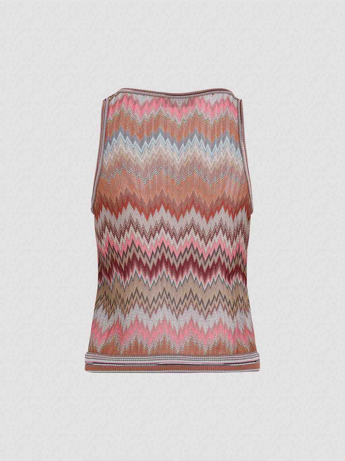 ミッソーニピンクとラストビスコーストップ。ピンクとラストトーンのビスコースとルレックスのブレンドで作られ、全体にシグネチャーのジグザグ、ラウンドネック、ノースリーブ、ストレートヘム。