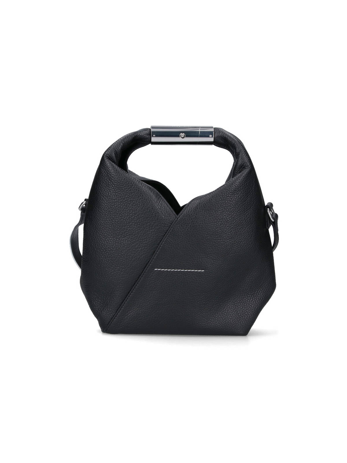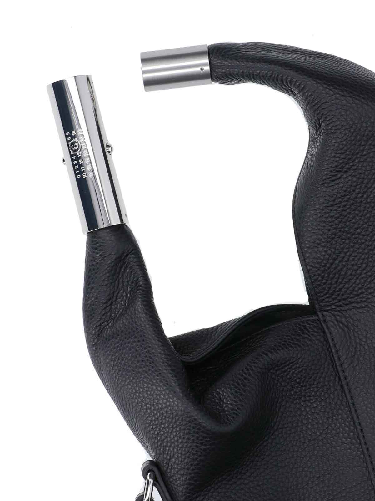 ブラックの質感のあるカーフスキンの小さな日本製mm6メゾンマルジェラバッグ、トップハンドル、取り外し可能で調節可能なショルダーストラップ、ハンドルに数字のロゴのディテールが刻印されています。バックステッチのディテール、メインの内部コンパートメント1つ。