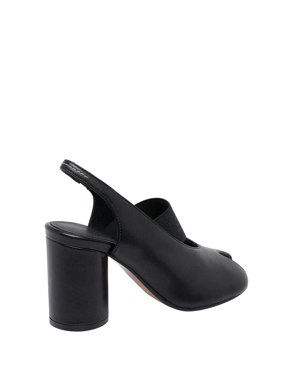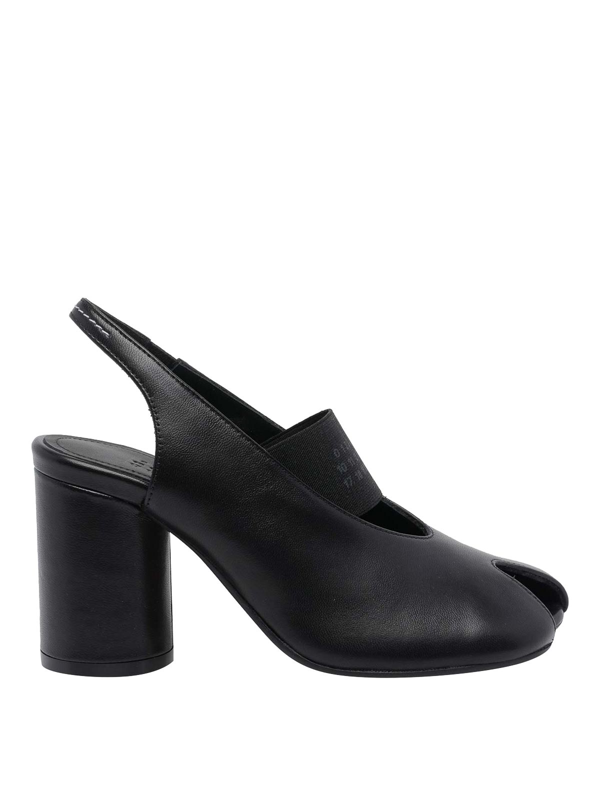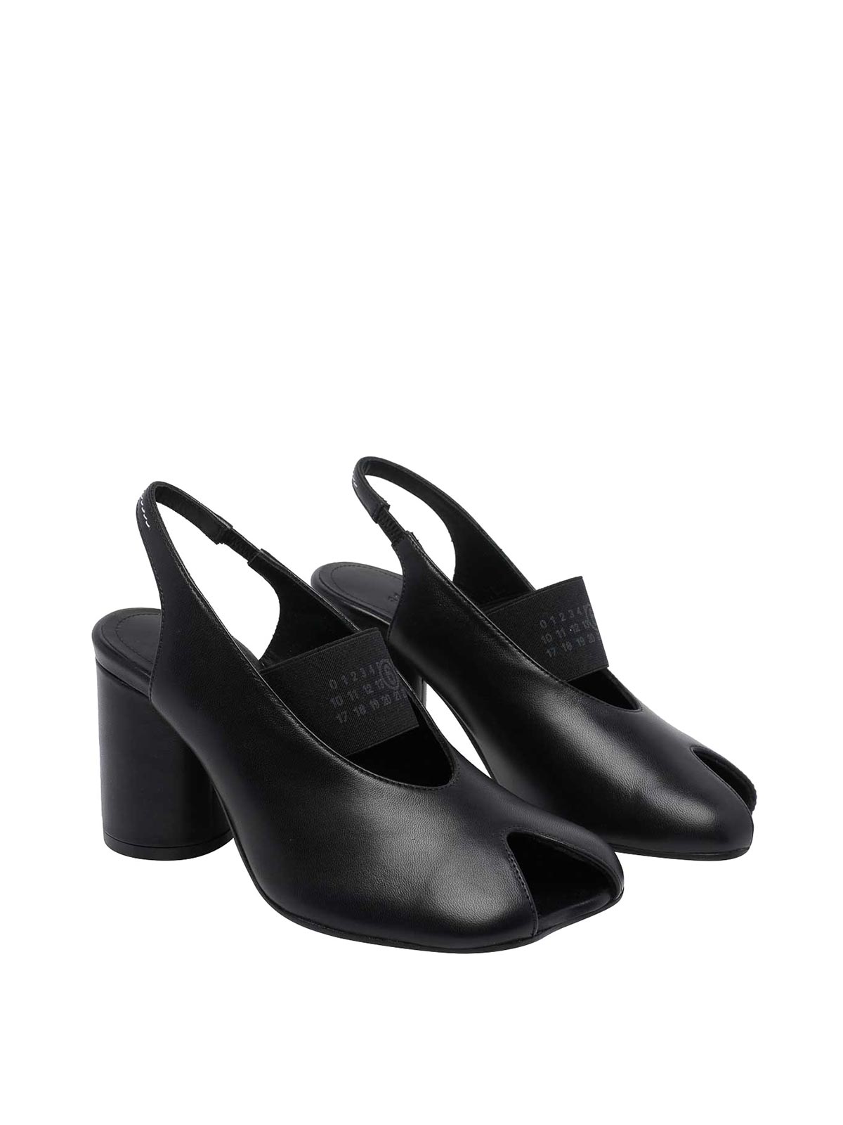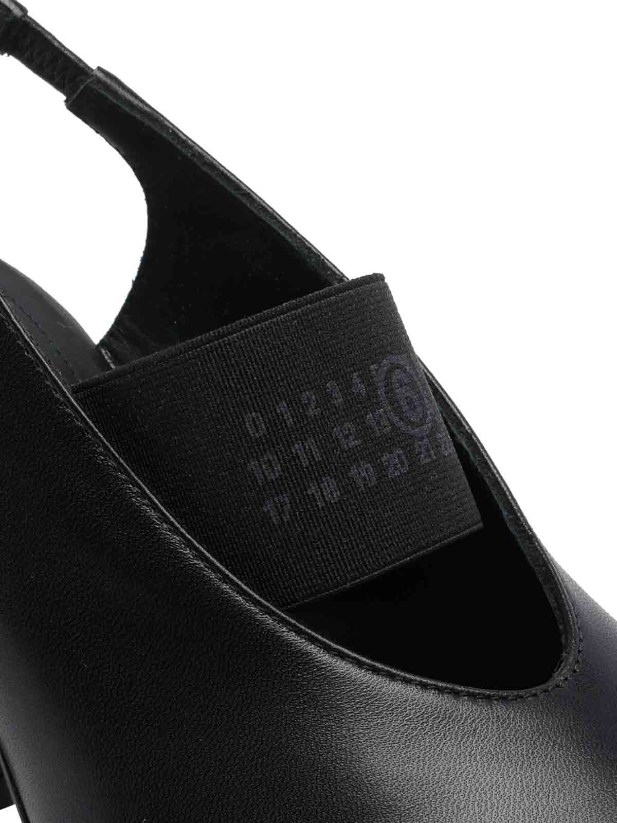 Mm6 maison margiela ブラックアナトミック数値スリングバック、ラウンドトウ、レザーアッパー、フロントトーンオントーンロゴバンド