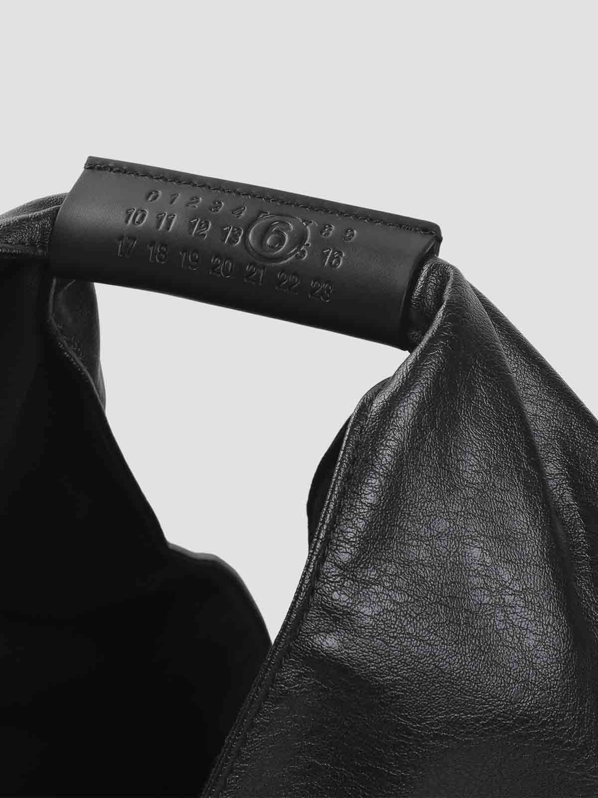 Mm6 maison margielaクラシックジャパニーズブラックポリウレタンショルダーバッグ。黒の人工皮革製、デボス加工の数字トップハンドル、端に2つのスナップボタンが付いた拡張可能なデザイン、背面にコントラストの効いた白いステッチ、裏地付き。