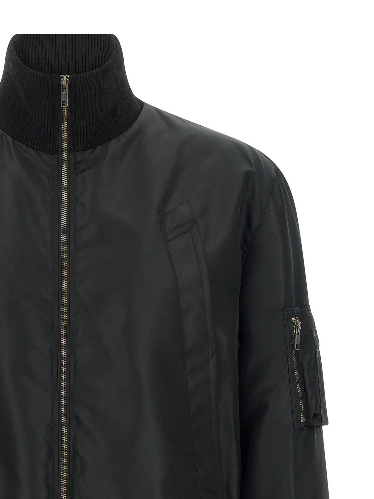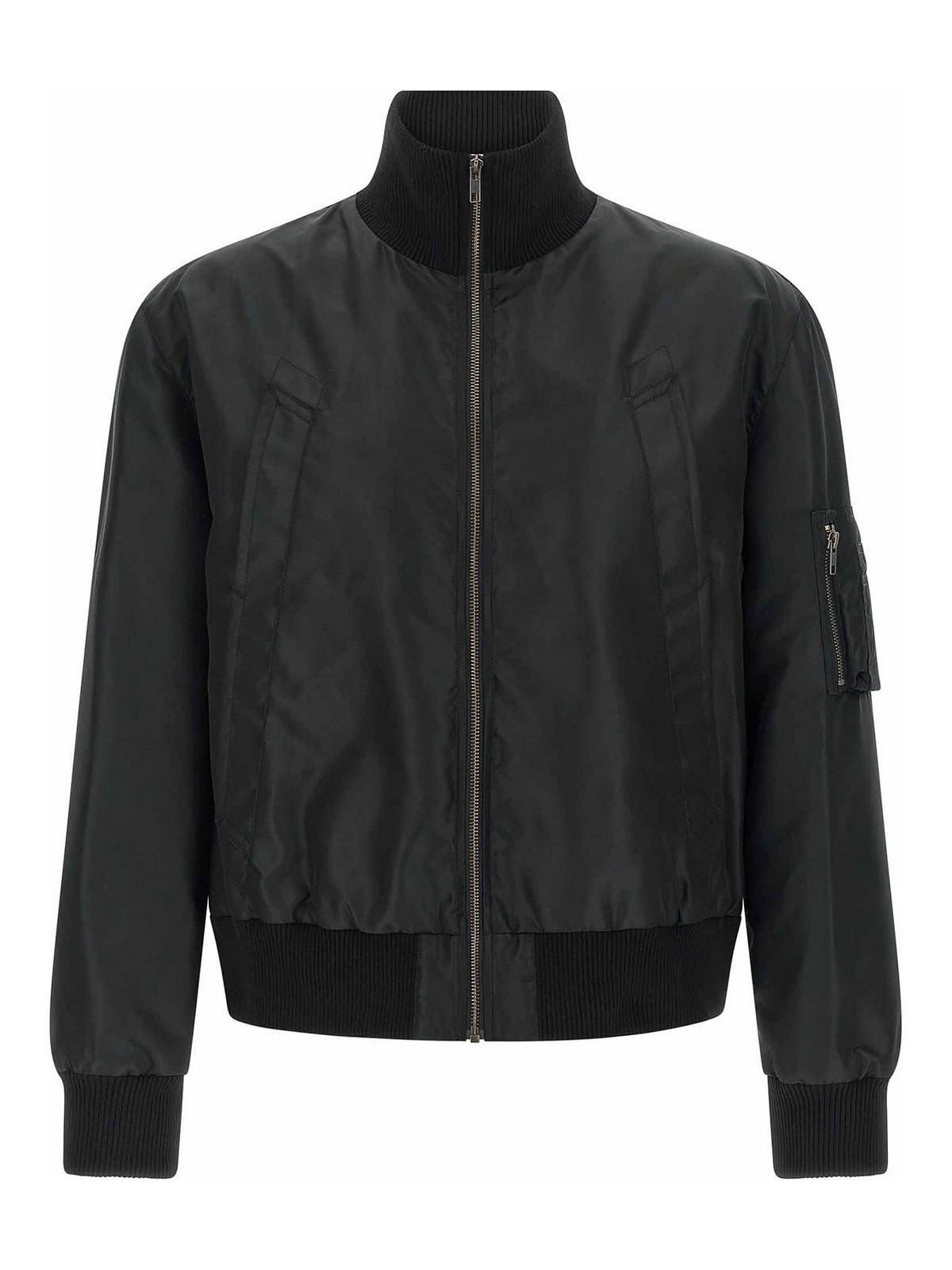 テックファブリックのボンバージャケット。トーン・オン・トーンのリブ編みストレッチニットのディテール、コントラストの効いた裏地、フロントファスナー、ハイネック、ポケット、袖口とドロップショルダー付きのロングスリーブ、後ろに「白いステッチライン」、ヘッドバンドが付いています。