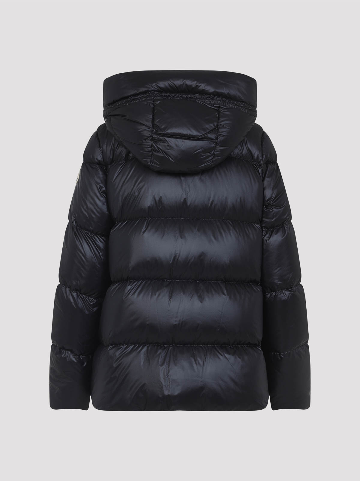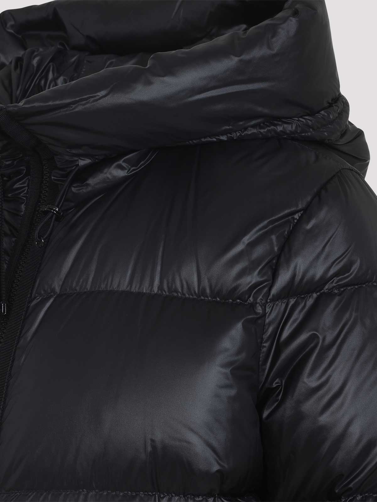 Moncler serittes ブラックポリアミドショートパーカー。ブラックテックファブリック製、キルト柄、フェザー入り、ドローストリング付きフード、フロントファスナー、フロントポケット 2 つ、袖にアイコニックなロゴパッチ、レギュラーフィット、裏地付き。