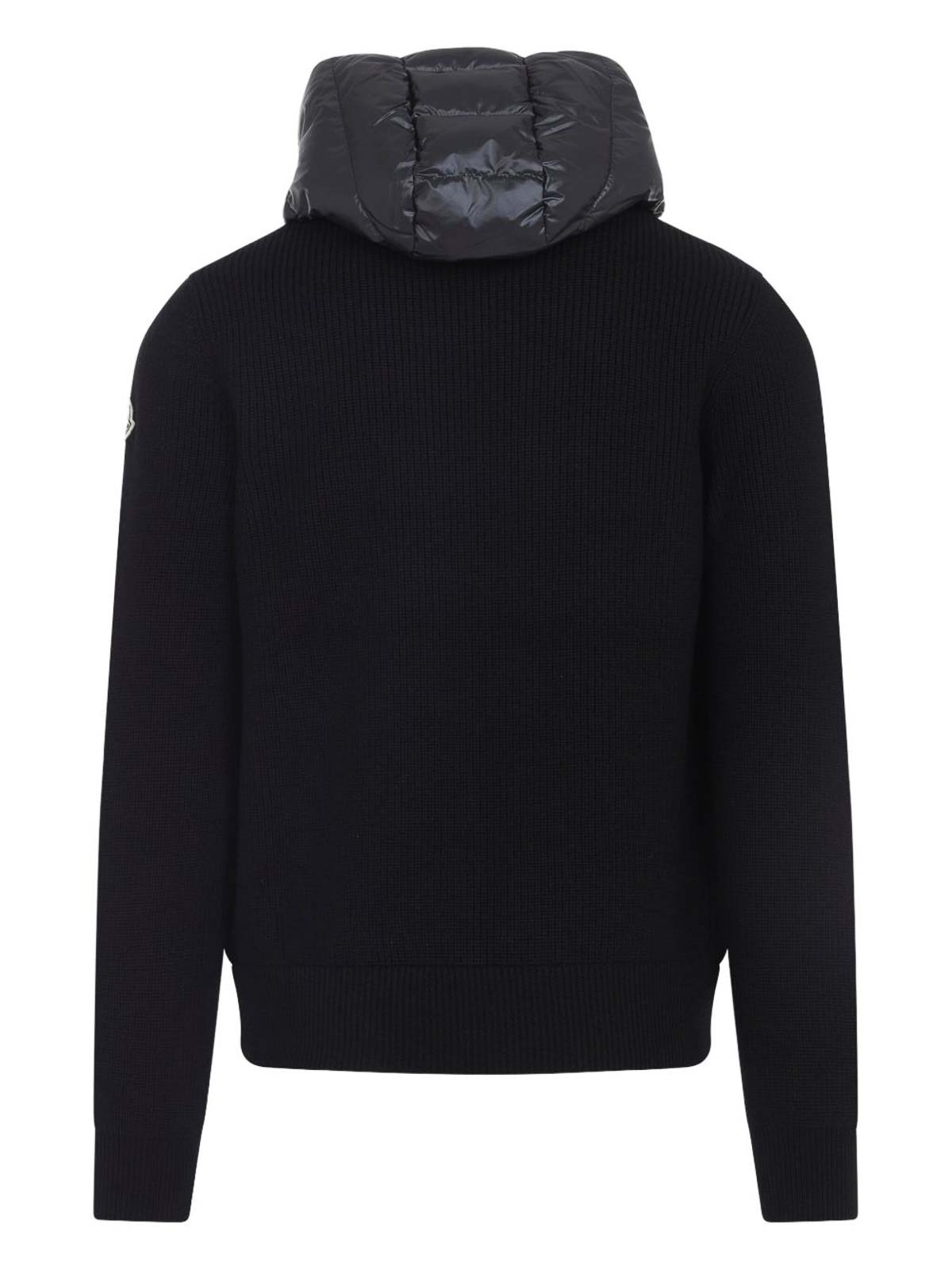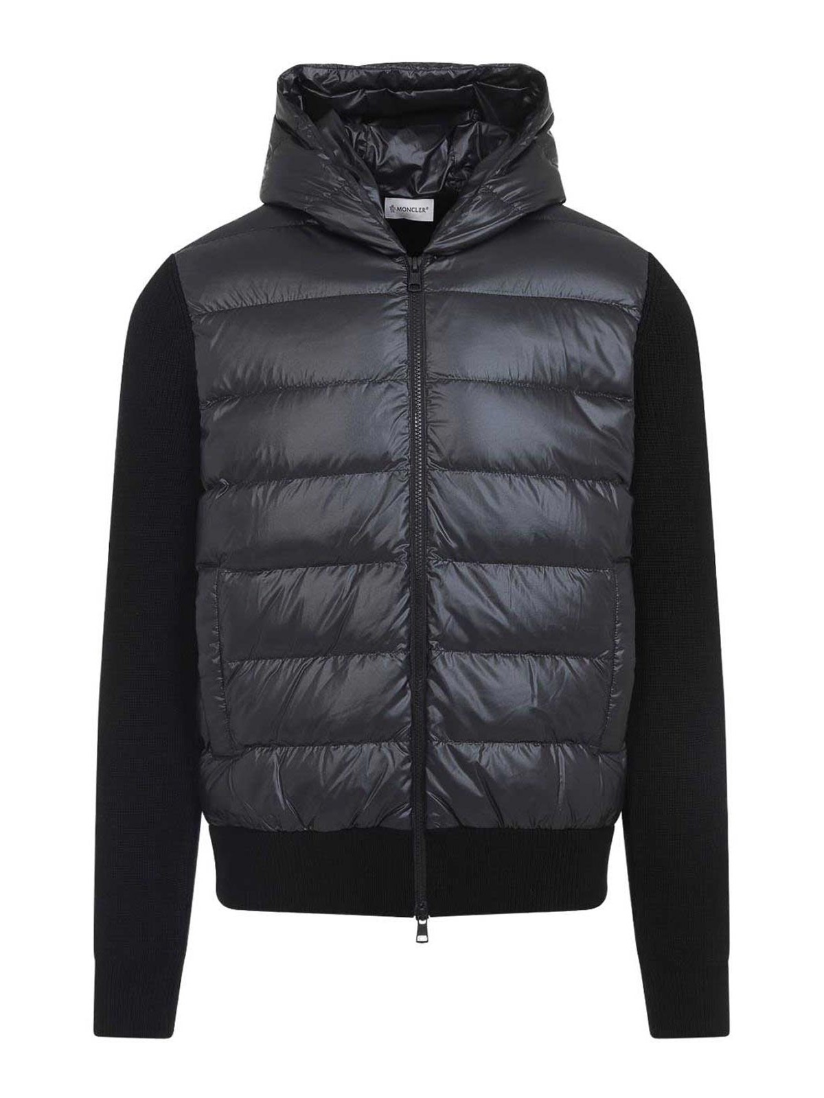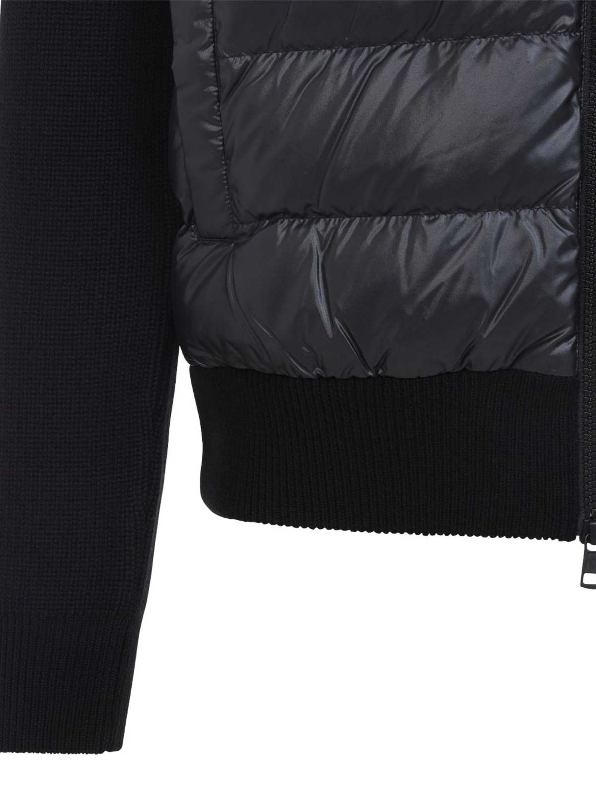 ブラックキルト、中綿パネル、リブ編みニットスリーブ、ジップフード付きネックライン、リブ編みニット