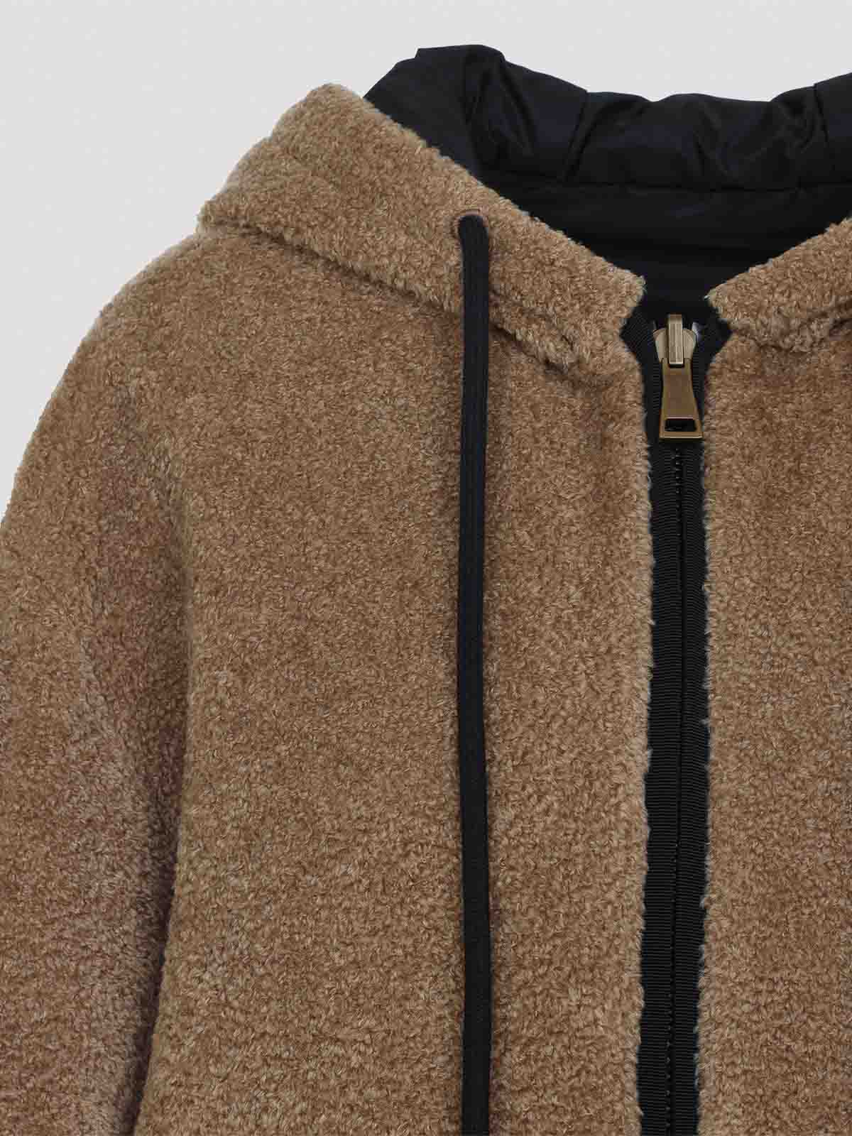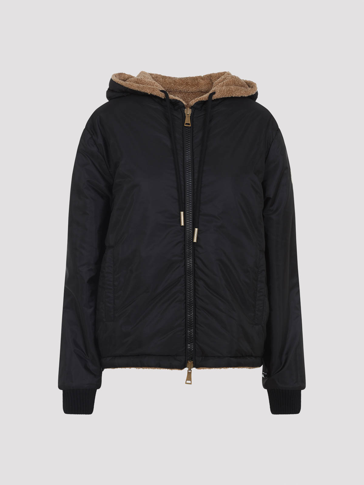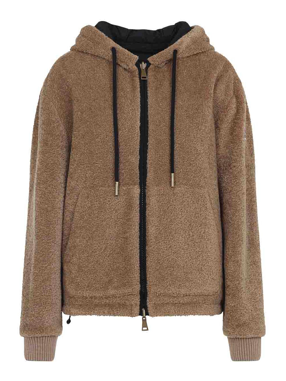 モンクレールジップアップブラウンジャケットダブル、フェイスジャケット。片面は人工茶色、もう片面は人工茶色、もう片面は黒のテックフード製で、ドローストリング付き、2ウェイジッパー、ドロップショルダー、ロングスリーブ、ポケットにはリブ編みの縁にロゴパッチ