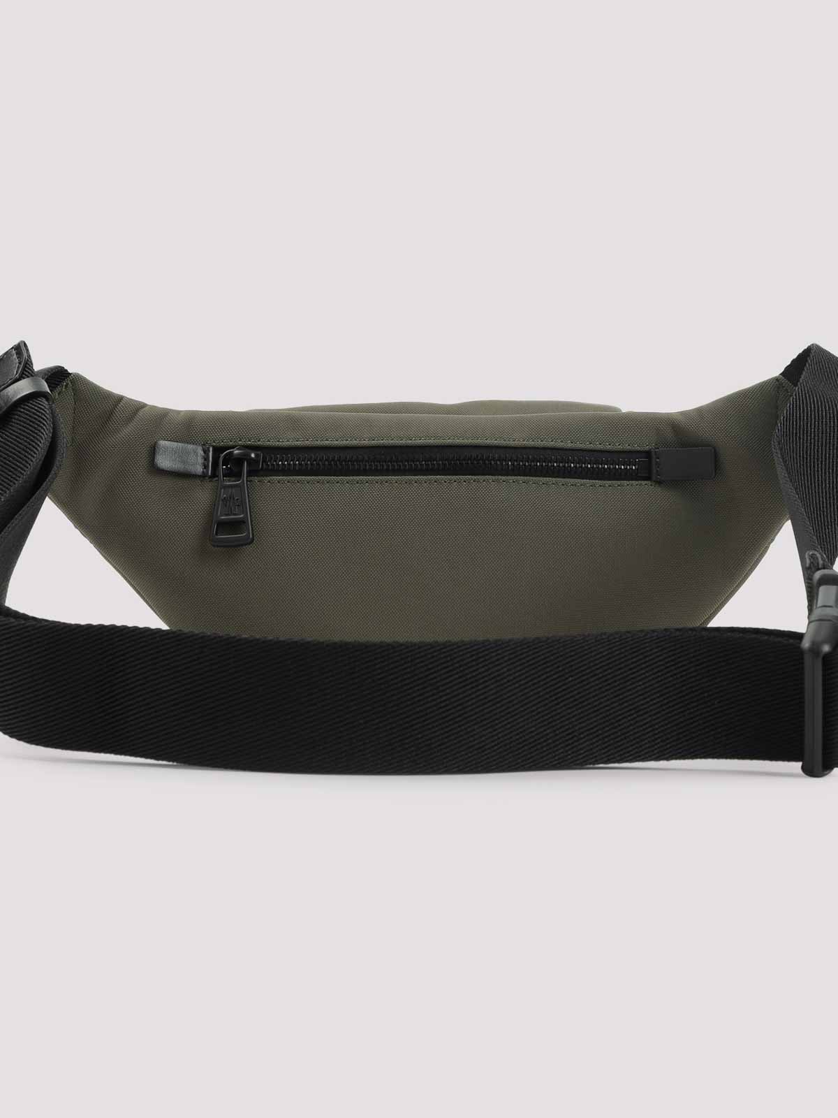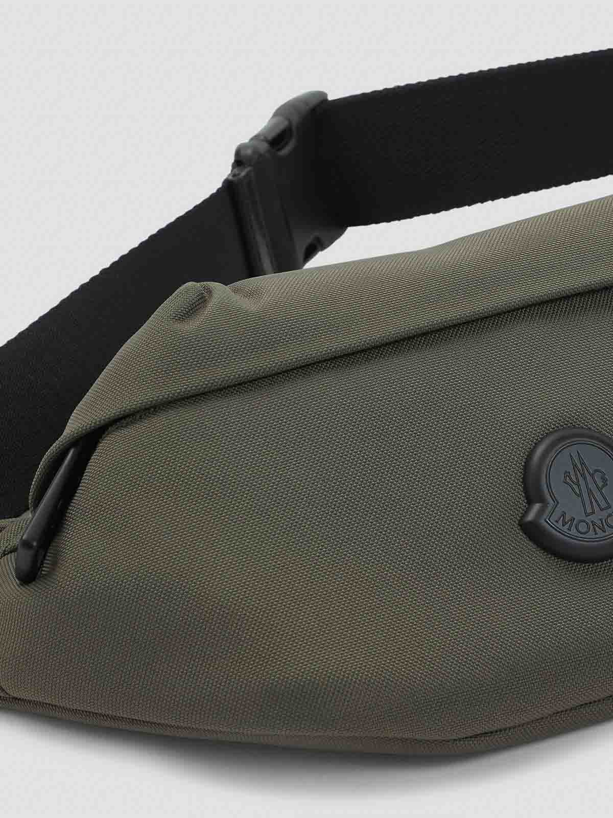 Moncler Durance スモールグリーンポリアミドベルトバッグ。グリーンナイロン製で、フロントファスナー、メタルフロントロゴ、バックジップポケット、プレスリリースバックル付きの調節可能なウェブショルダーストラップ、ナイロン裏地が特徴です。