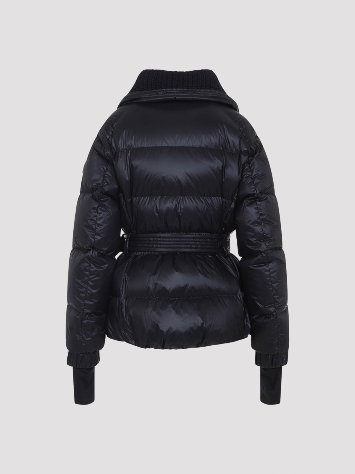 モンクレールグルノーブルネイビーブルーのバタイユースジャケット。ポリアミド生地製、ニットの裏地が付いたポインテッドカラー、フロントコンシールファスナー、フロントボタン留め、色調調節可能なベルト、サイドポケット、ロングスリーブ、右袖にパッチロゴ、ボタン付き伸縮性カフス、親指穴付きファブリックカフス、ストレートヘム、パッド入りデザイン。