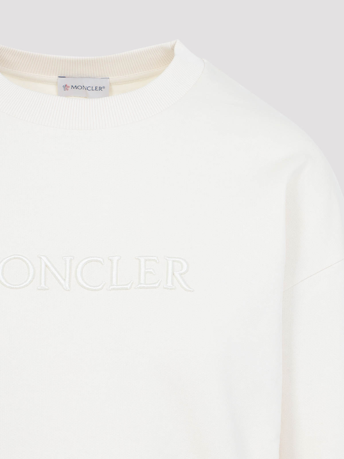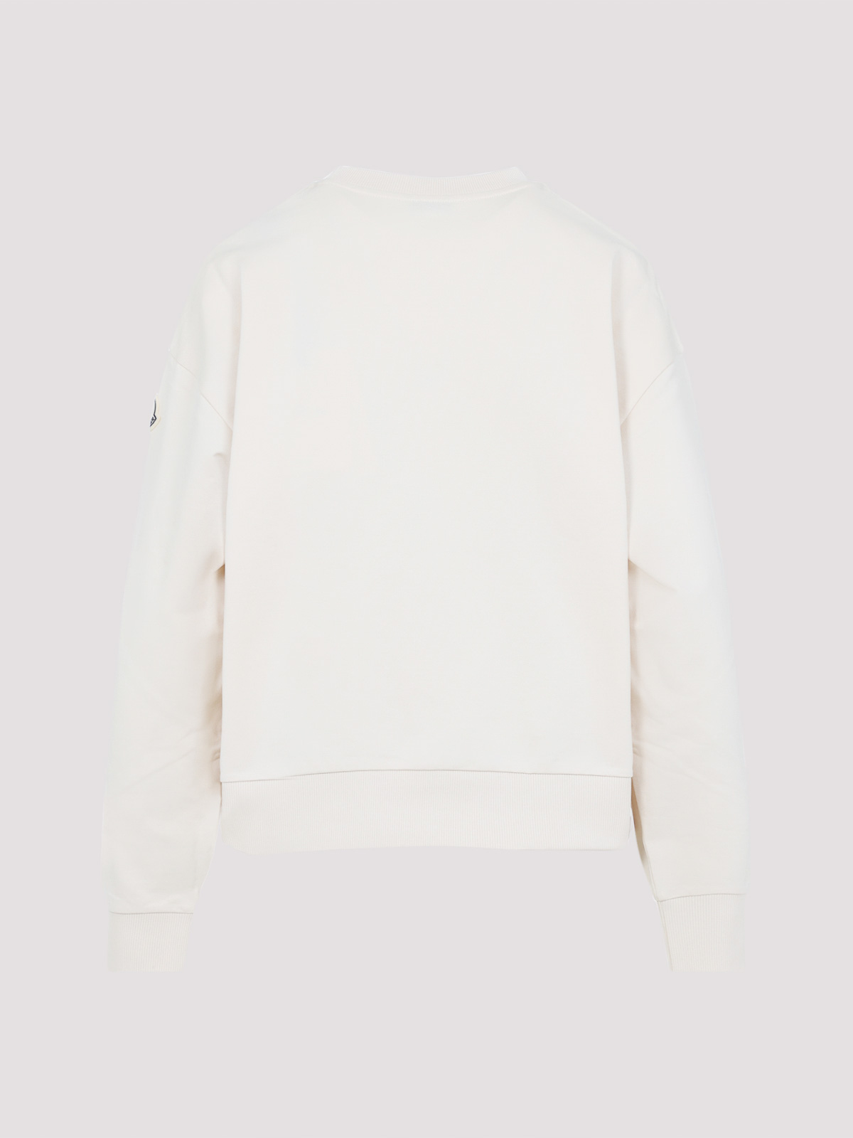 モンクレールホワイトコットンスウェットシャツ。ホワイトコットン製で、ラウンドネック、胸に同系色の刺繍ロゴ、ドロップショルダー、ロングスリーブ、左袖にテキスタイルのロゴパッチ、リブ編みのトリムが特徴です。