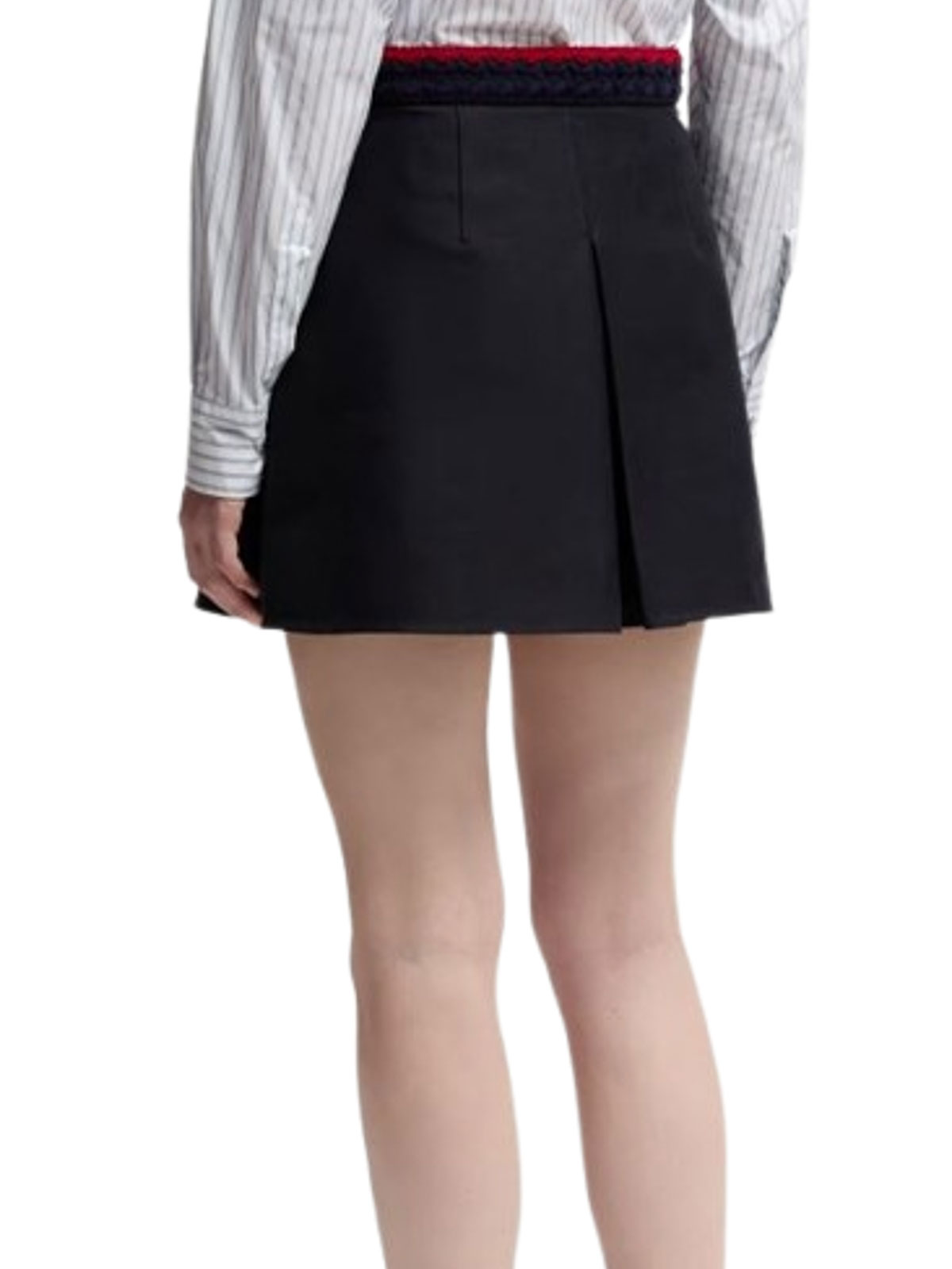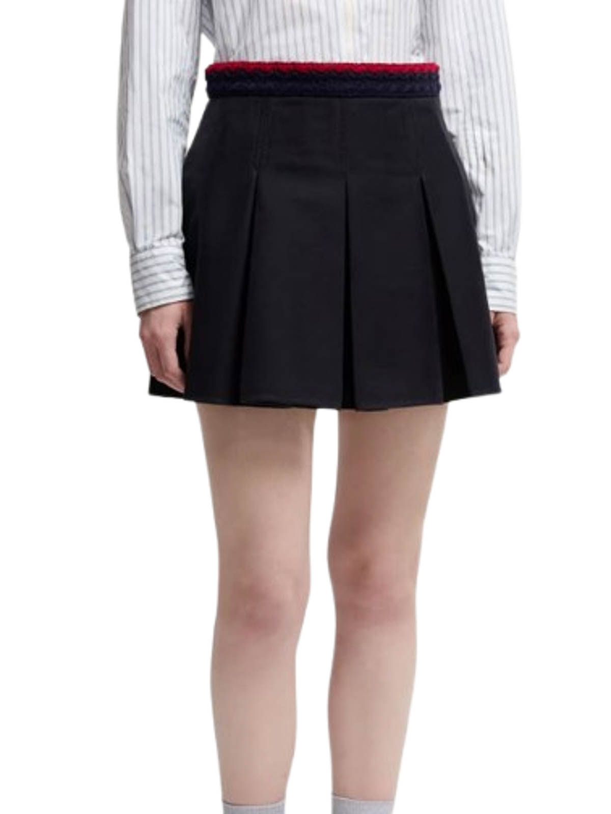 繊細な編み込みトリムをあしらったブルーのプリーツミニスカート。サイドジッパー。