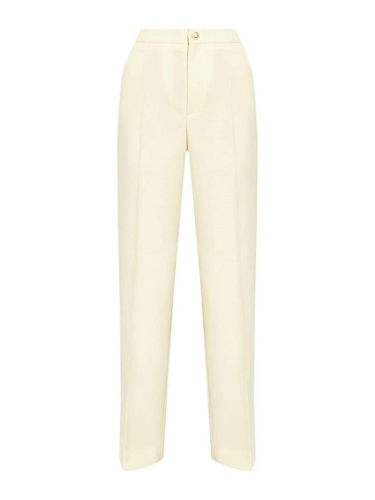 ライトベージュのツイル織りのハイライズプレスクリースのフロントボタンとサイドにジッパー付きのストレートレッグスリップポケット