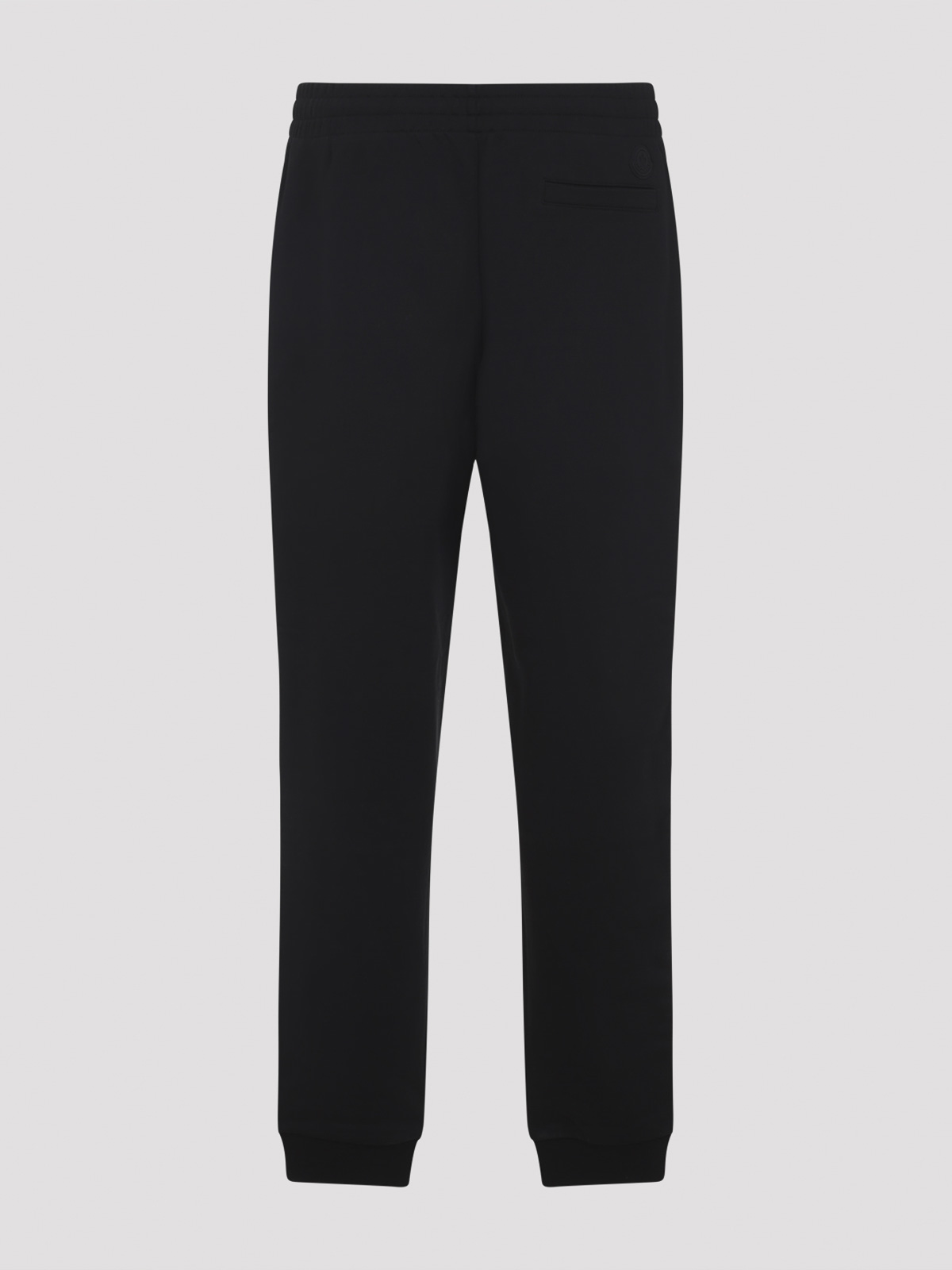 モンクレールブラックコットントラックパンツ。ブラックコットン製で、隠しドローストリング付きの伸縮性ウエストバンド、股下サイドポケット、サイドにロゴ刻印入り、背面にウェルトポケット、リブ編みの袖口が特徴です。