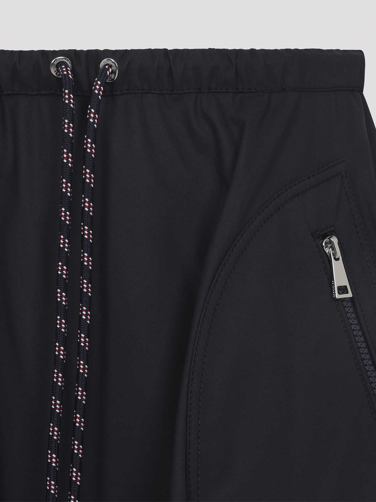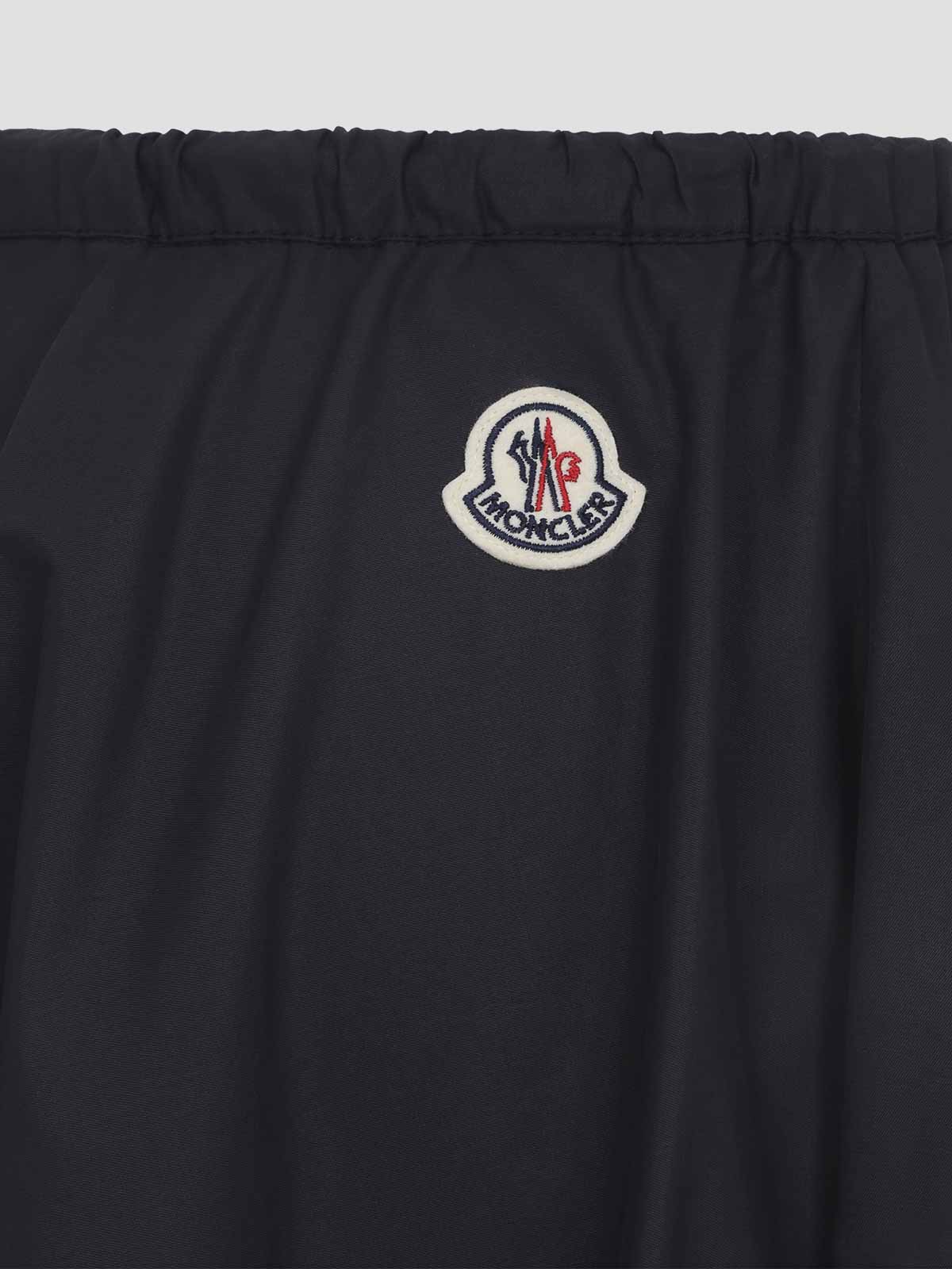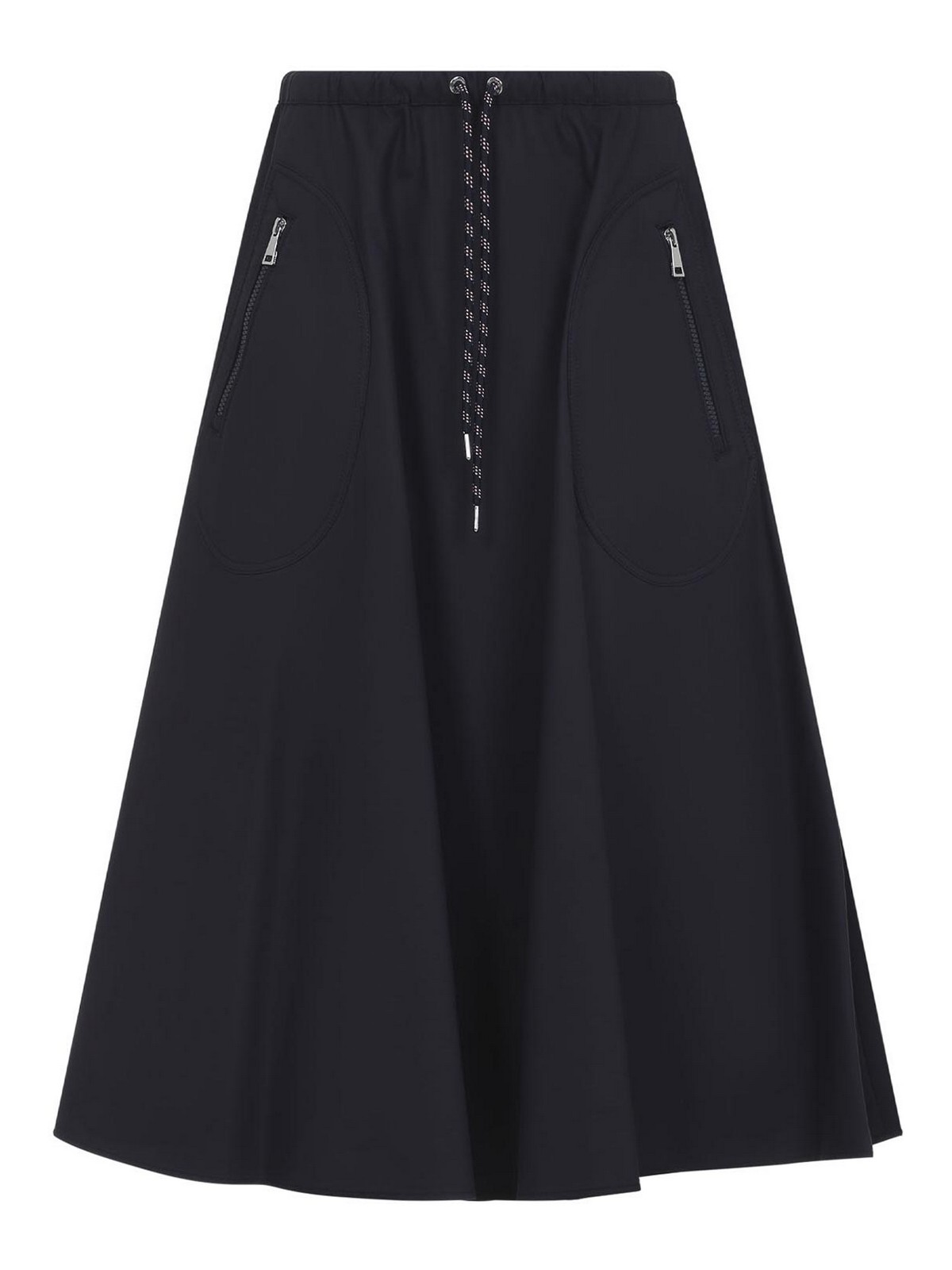 モンクレールコットンネイビーミディスカート。ネイビーブルーのコットン混紡で作られたAラインミディスカート。ドローコード付きの伸縮性ウエストバンド、前面に2つのジッパーポケット、背面にロゴパッチが付いています。