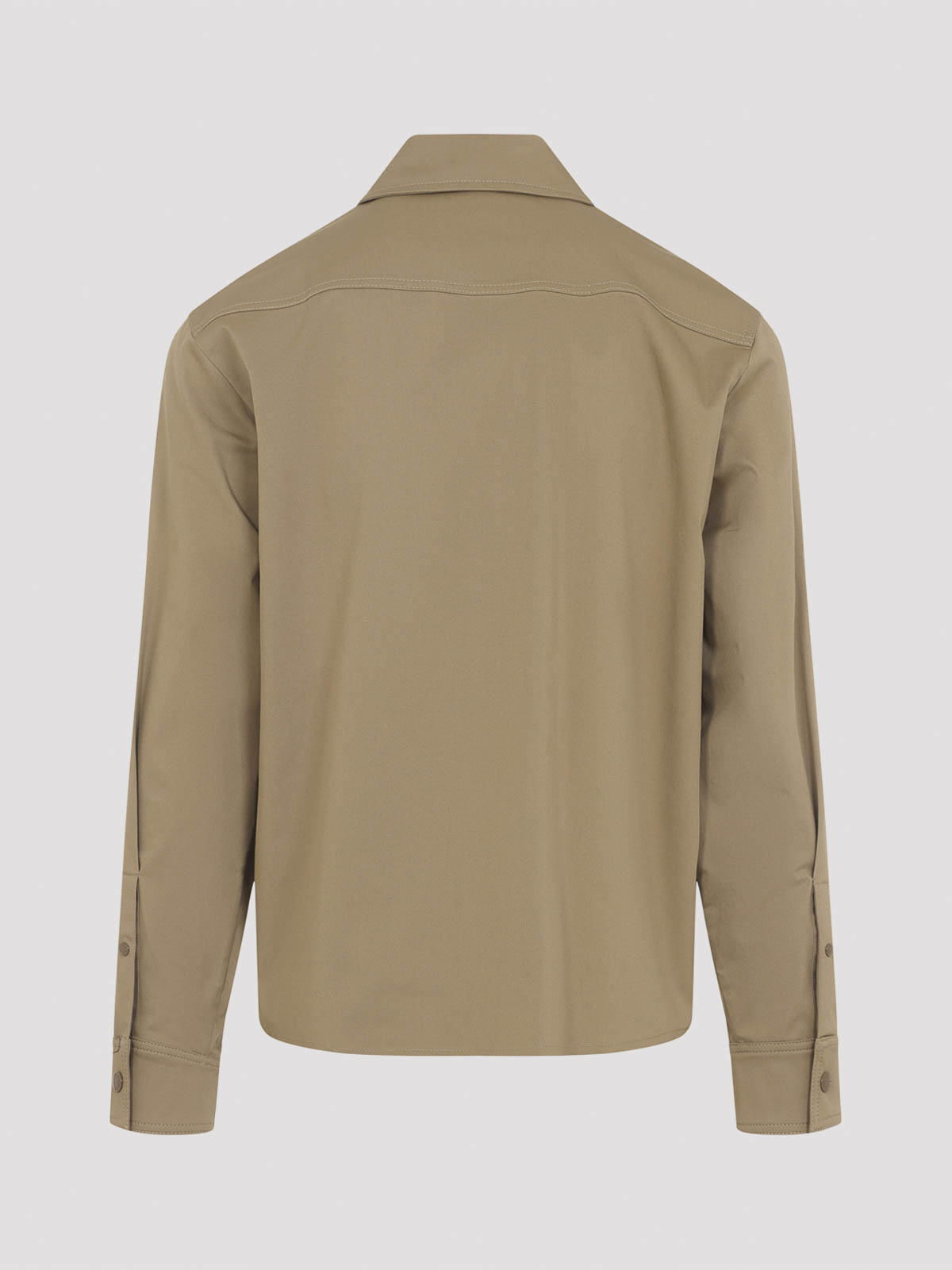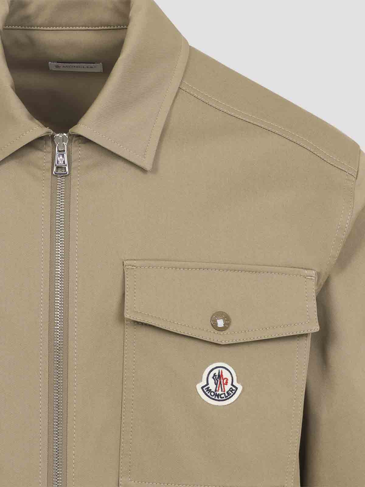 モンクレールベージュコットンシャツ。ベージュのコットンギャバジン製で、ポインテッドカラー、フロントのツーウェイファスナー、胸にロゴパッチ付きのフラップポケット、フロントポケット2つ、ボタン付きカフス付きロングスリーブ、バックヨーク、ストレートヘムが特徴です。