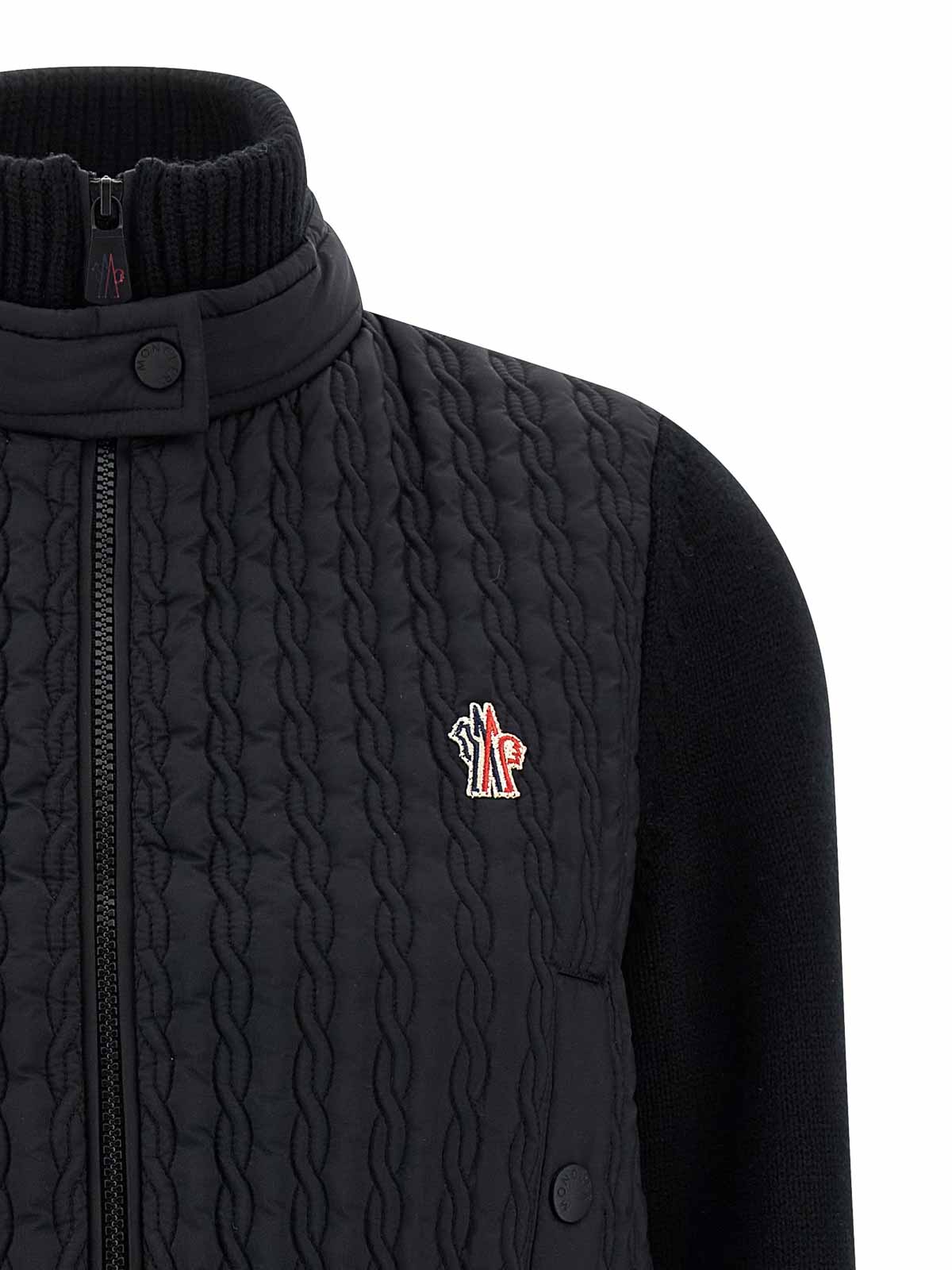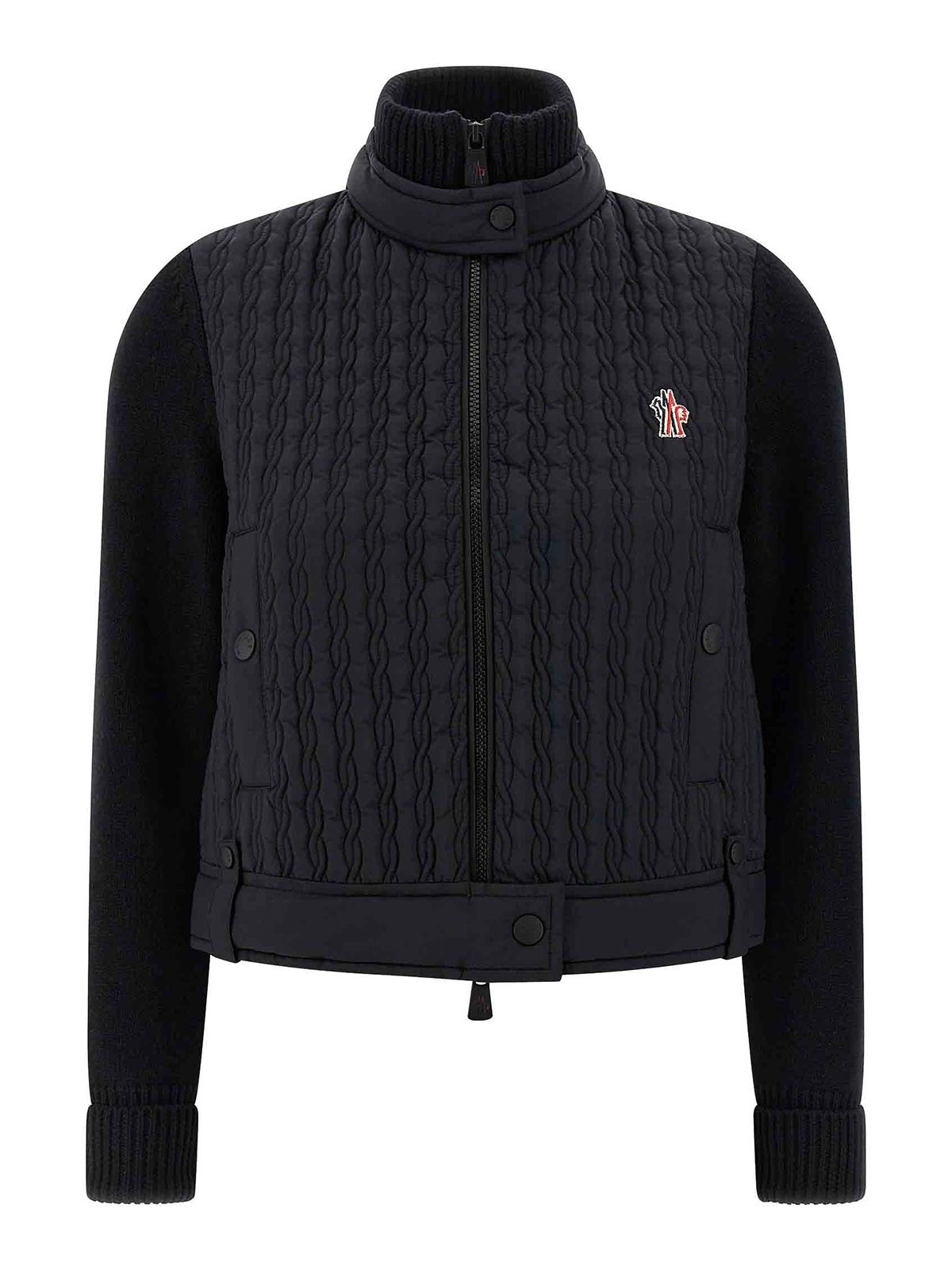 トリコットのウールニットカーディガン、パッド入りキルトフロントパネル、ハイネック、ジッパー、サイドポケット、フロントロゴパッチ付き。