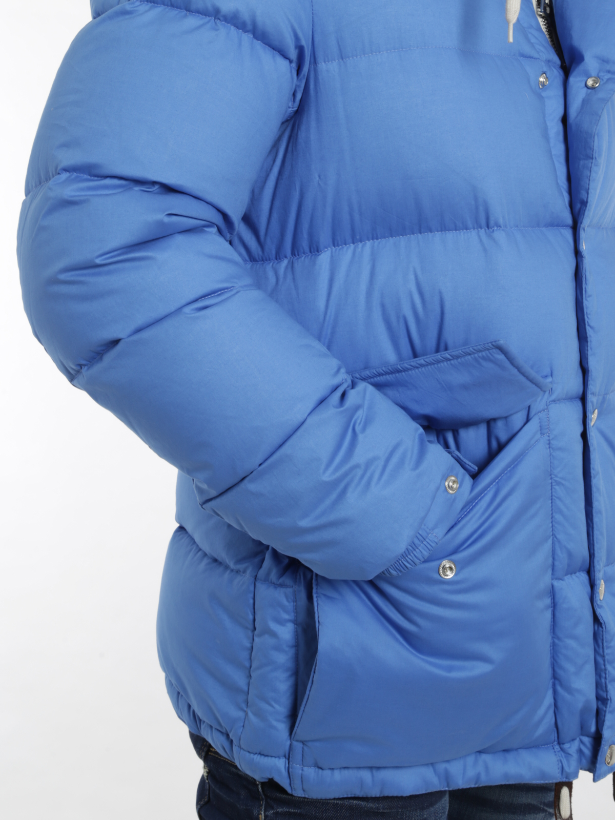 Padded jacket in high-tech fabric detailed with logo patch on the left sleeve, covered zip fly, snap button closure, drawstring hood, two snap flap pockets, elasticized snap cuffs, drawstring hemline, one inside zip pocket, tonal lining and goose down padding.