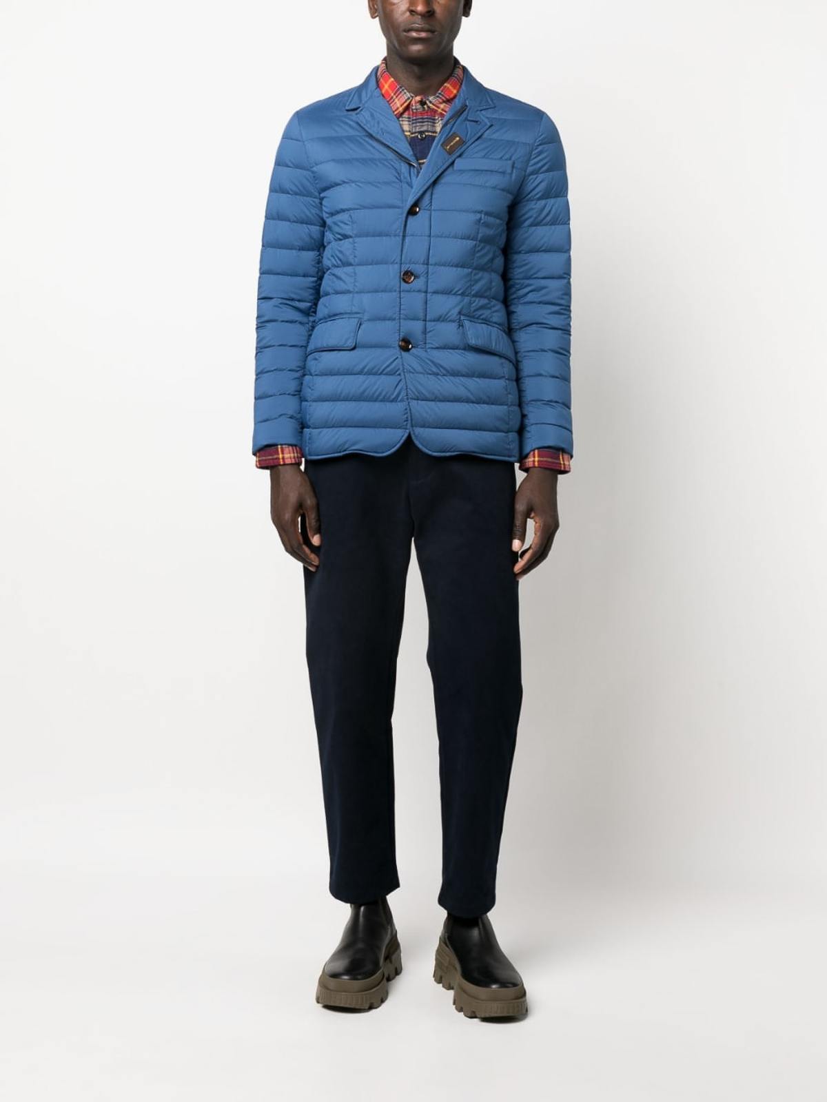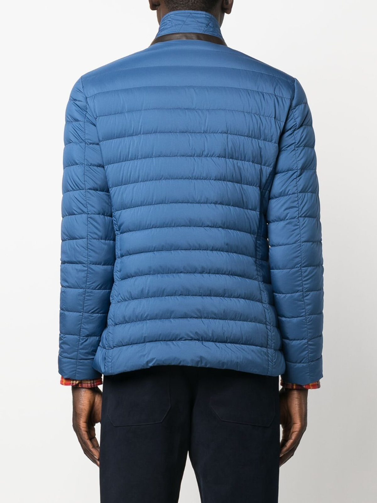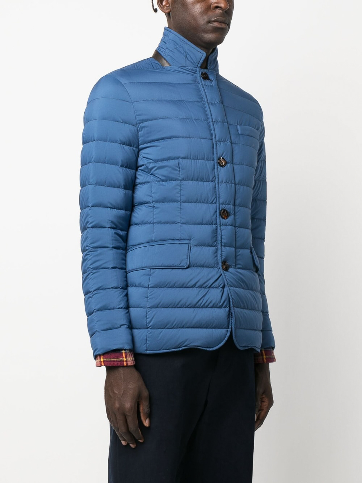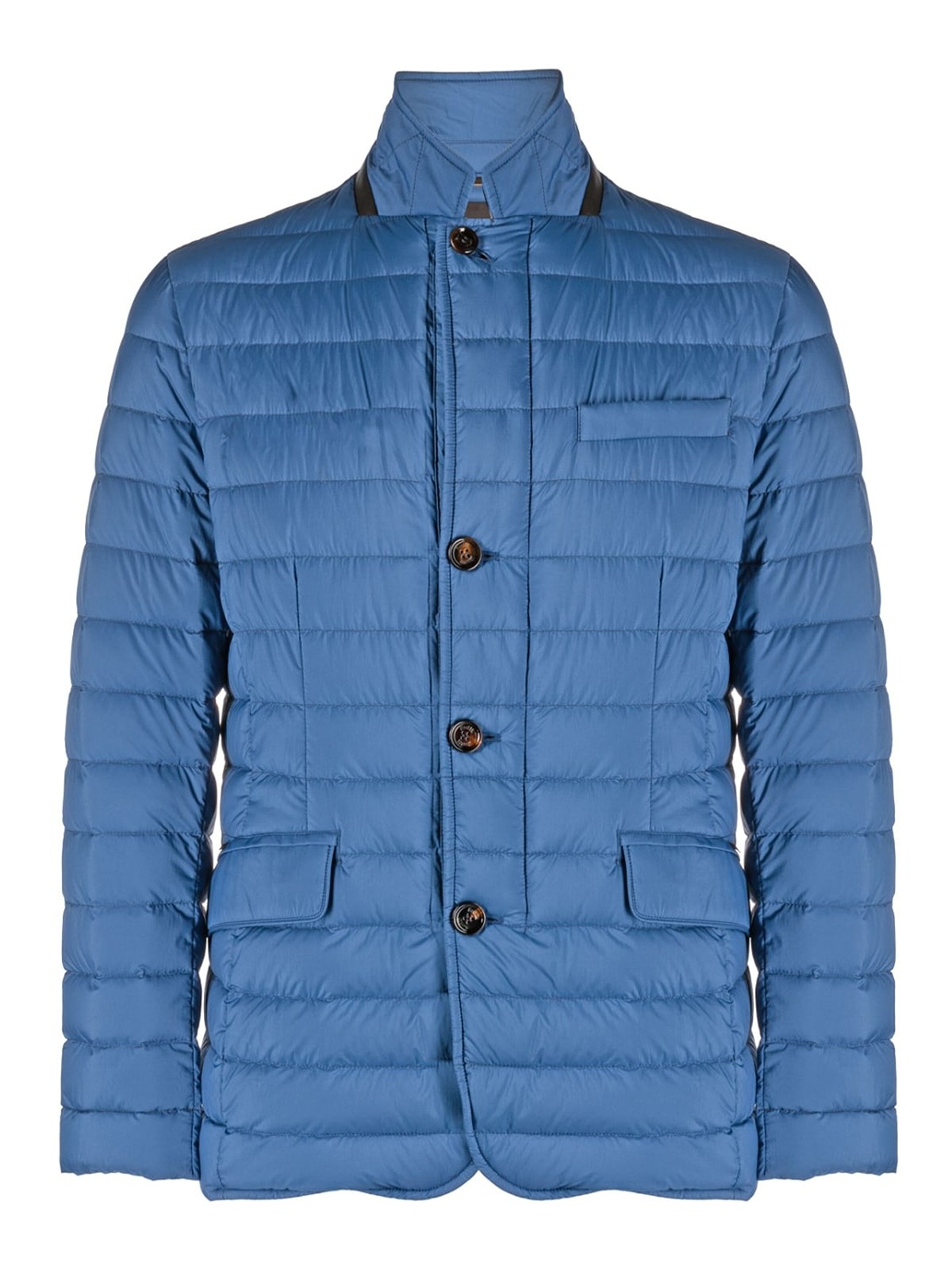 moorerのZavyer-S3パファージャケット。シアンブルー、フェザーダウン、パッド入りデザイン、軽量構造、スタンドカラー、フロントボタン留め、胸にウェルトポケット、フロントフラップポケット2つ、ロングスリーブ、ストレートヘム。