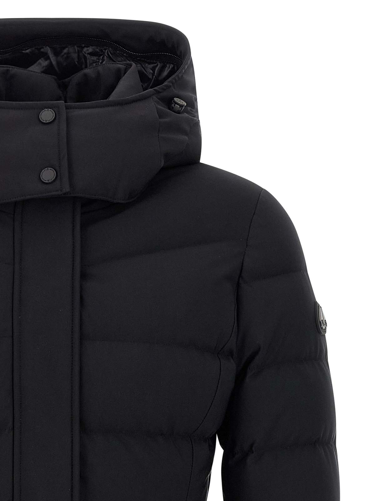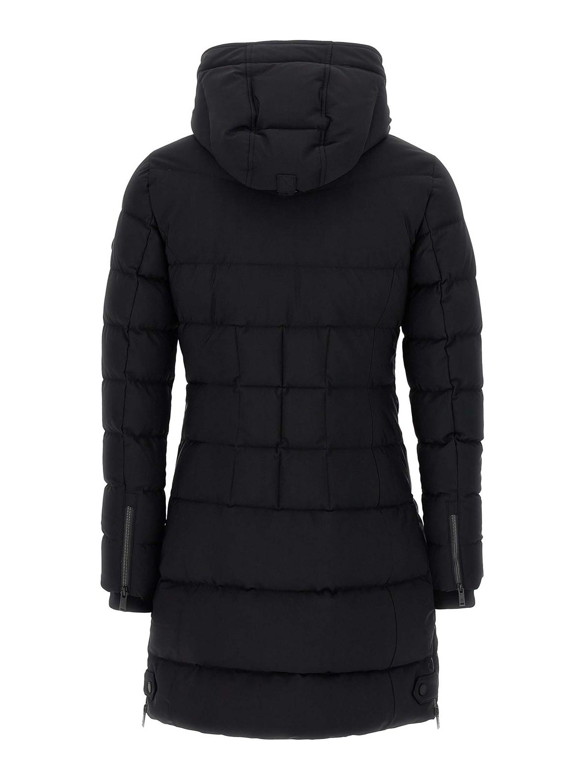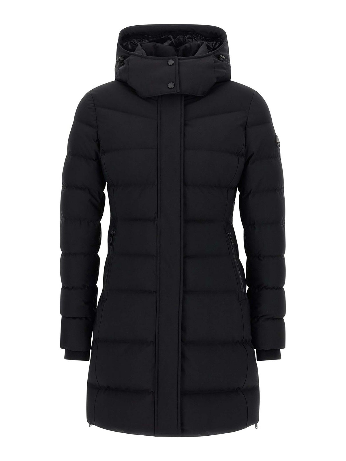 パッド入りキルト加工の「ウォーターシェッドパーカー」ジャケット取り外し可能なフード付き仕上げ替え用ジッパー付きハイネックフード付きサイドロゴパッチ膝丈サイドジッパー付きスリット付き膝丈サイドジップスリット付きロングスリーブ(裾はニットカフス)