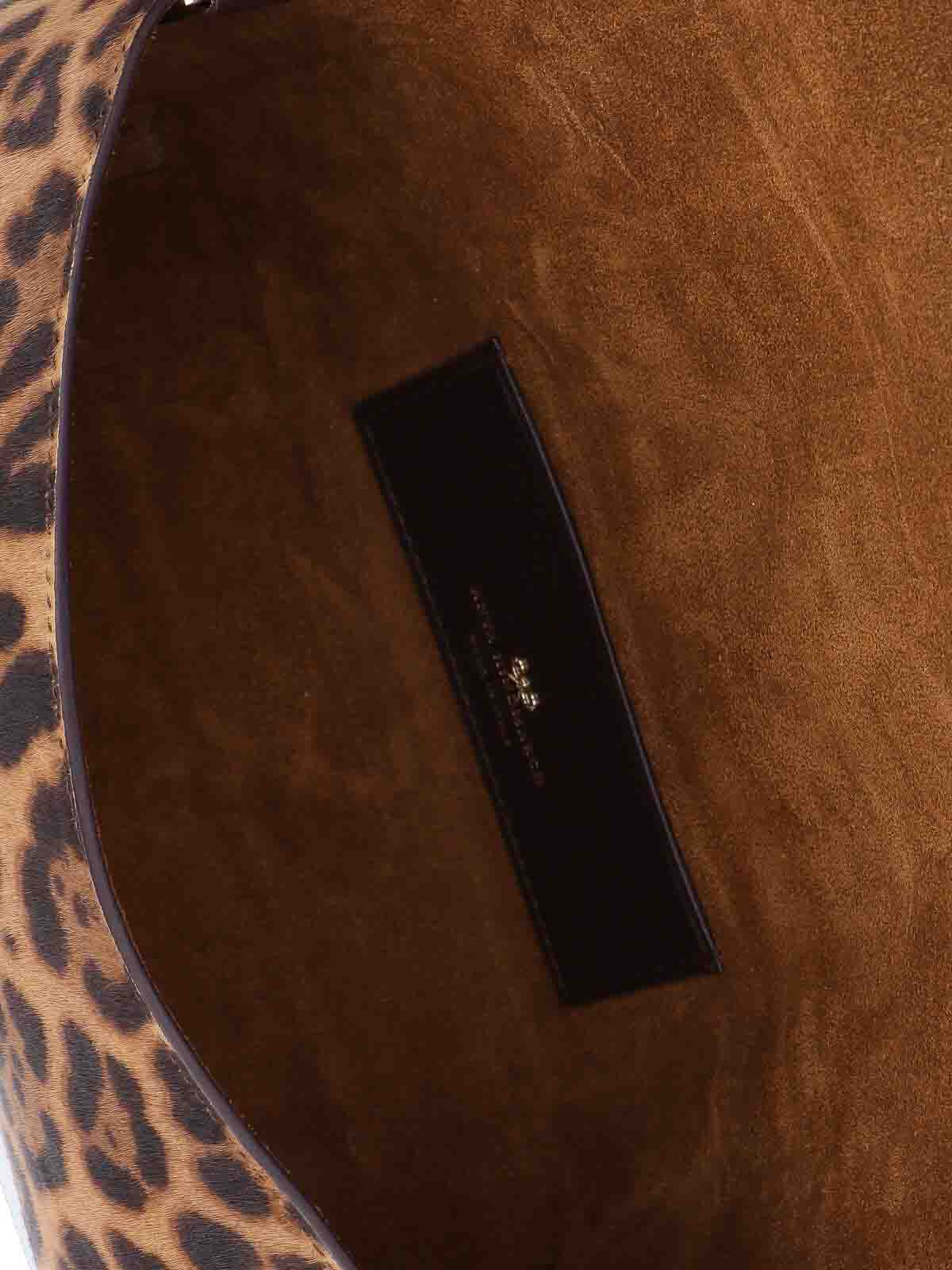 ブラウンカーフスキンのアーニャ・ハインドマーチ・モーティマーショルダーバッグ、アニマリエモチーフ、フロントメタルクロージャー、調節可能なショルダーストラップ、内部コンパートメント1つ。