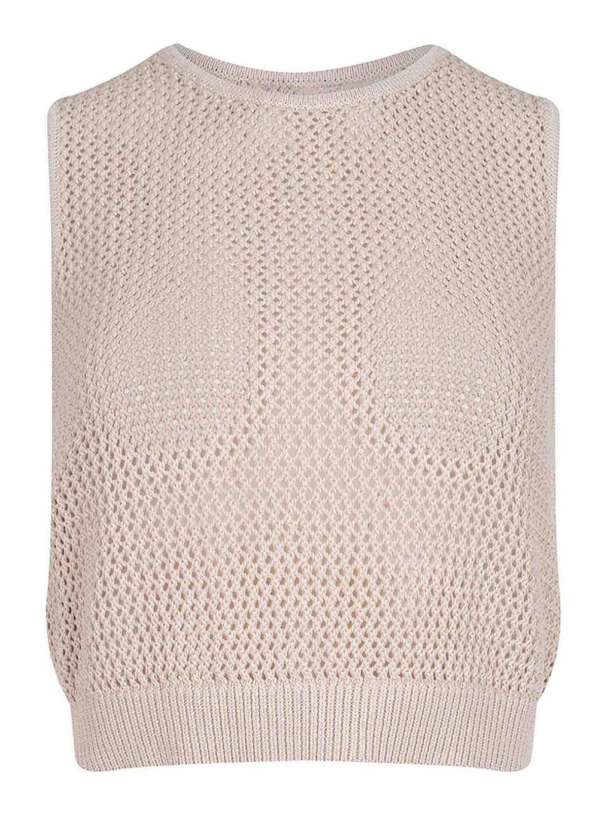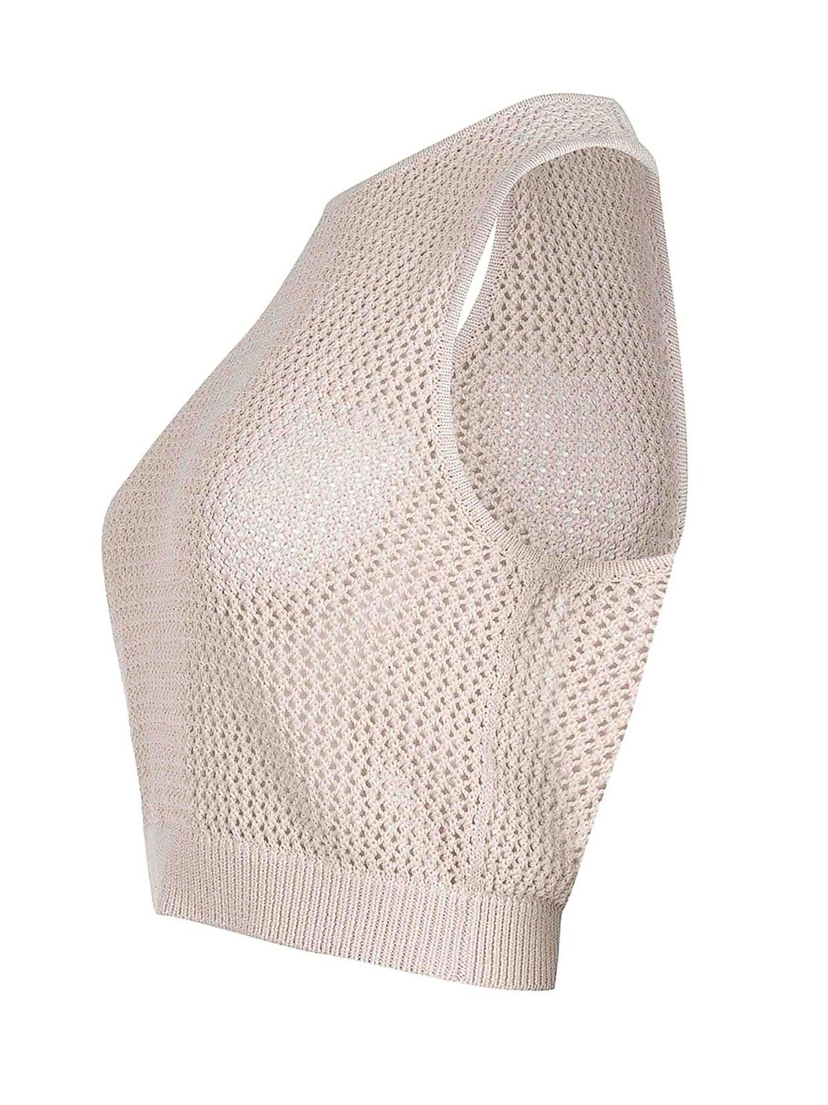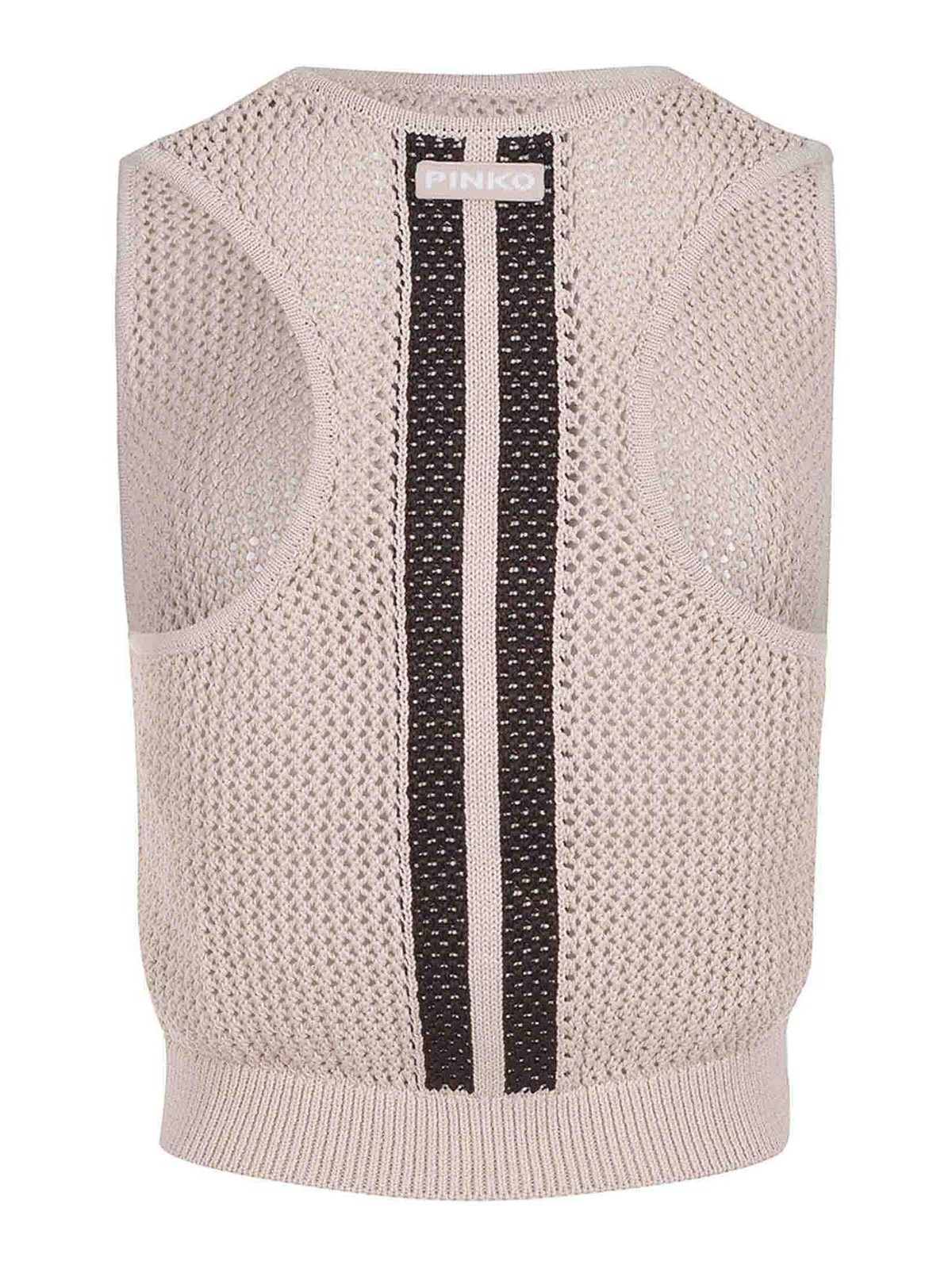 ベージュのかぎ針編みでできたピンコ「モーラス」のトップス、完全にシースルー、リブ編みのクルーネック、ノースリーブ、リブ編みの裾、背面のコントラストの効いたディテール、コントラストの効いたロゴラベルの刺繍、62% コットン、38% ナイロン。