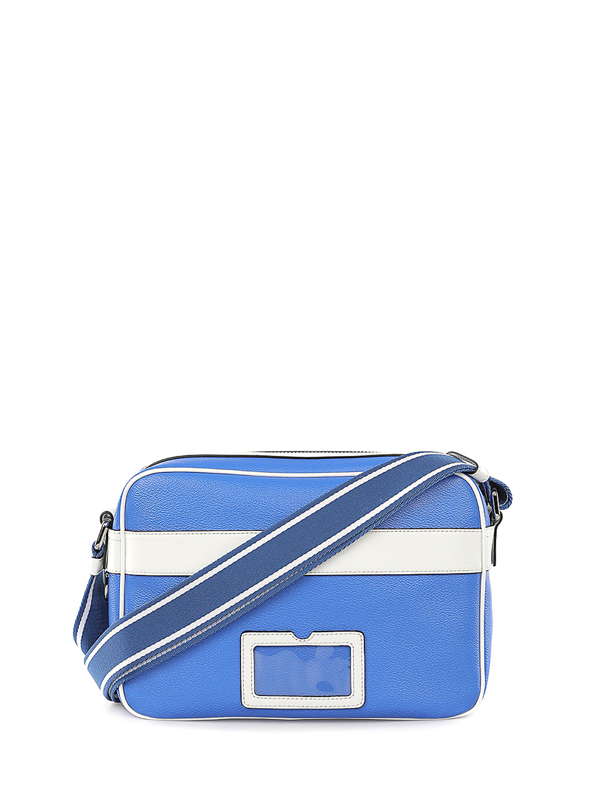 ブルーのダブルスマイルワールドメッセンジャー、アイコニックなモスキーノのダブルスマイルプリントが特徴のコーティングキャンバス生地のクロスボディメッセンジャーバッグ、前面にジッパー付きポケット、レザートリム、コットン裏地、布製ショルダーストラップ、ポリウレタン樹脂 80%、レザー 20%、幅 x 幅 x 幅 x 高さ x 幅 x 奥行