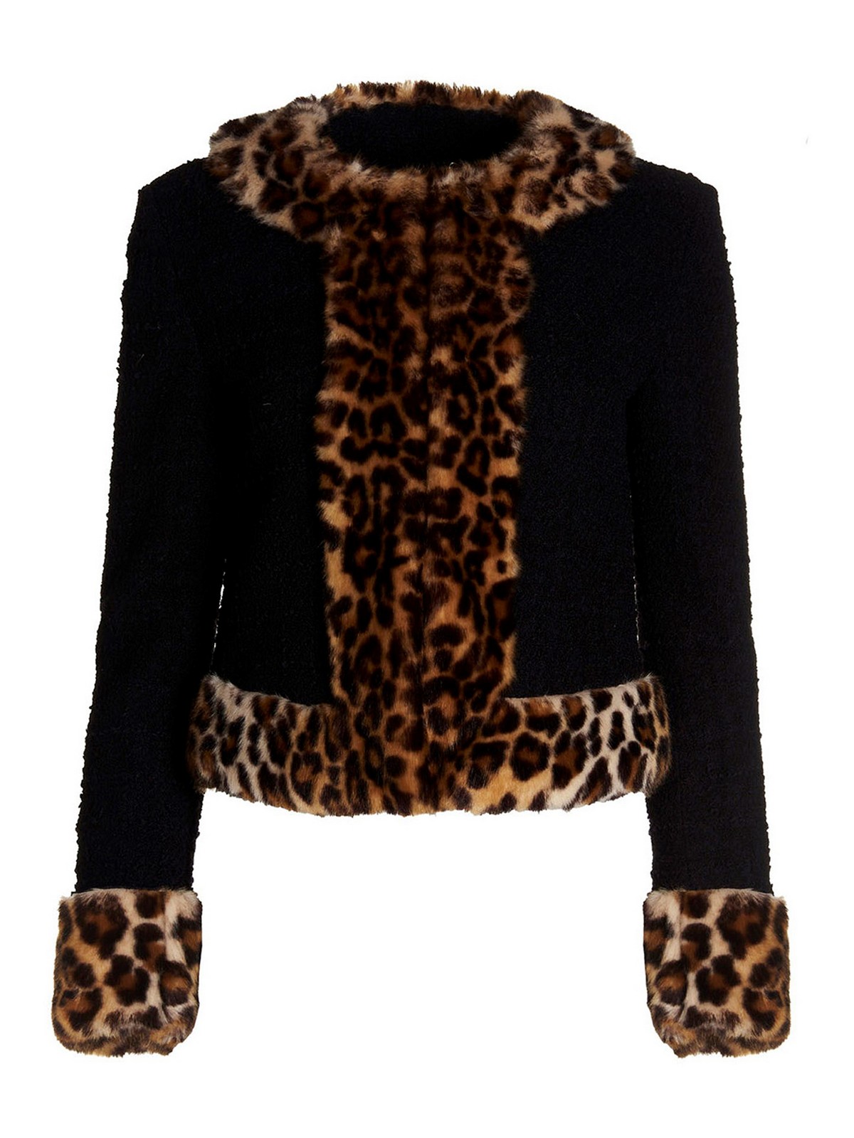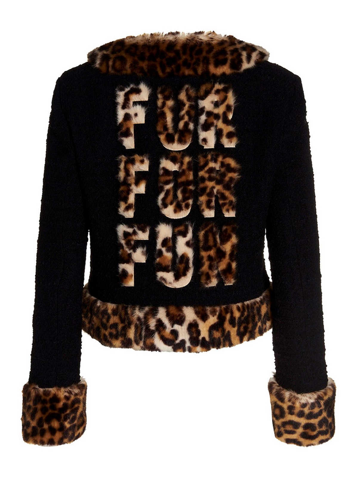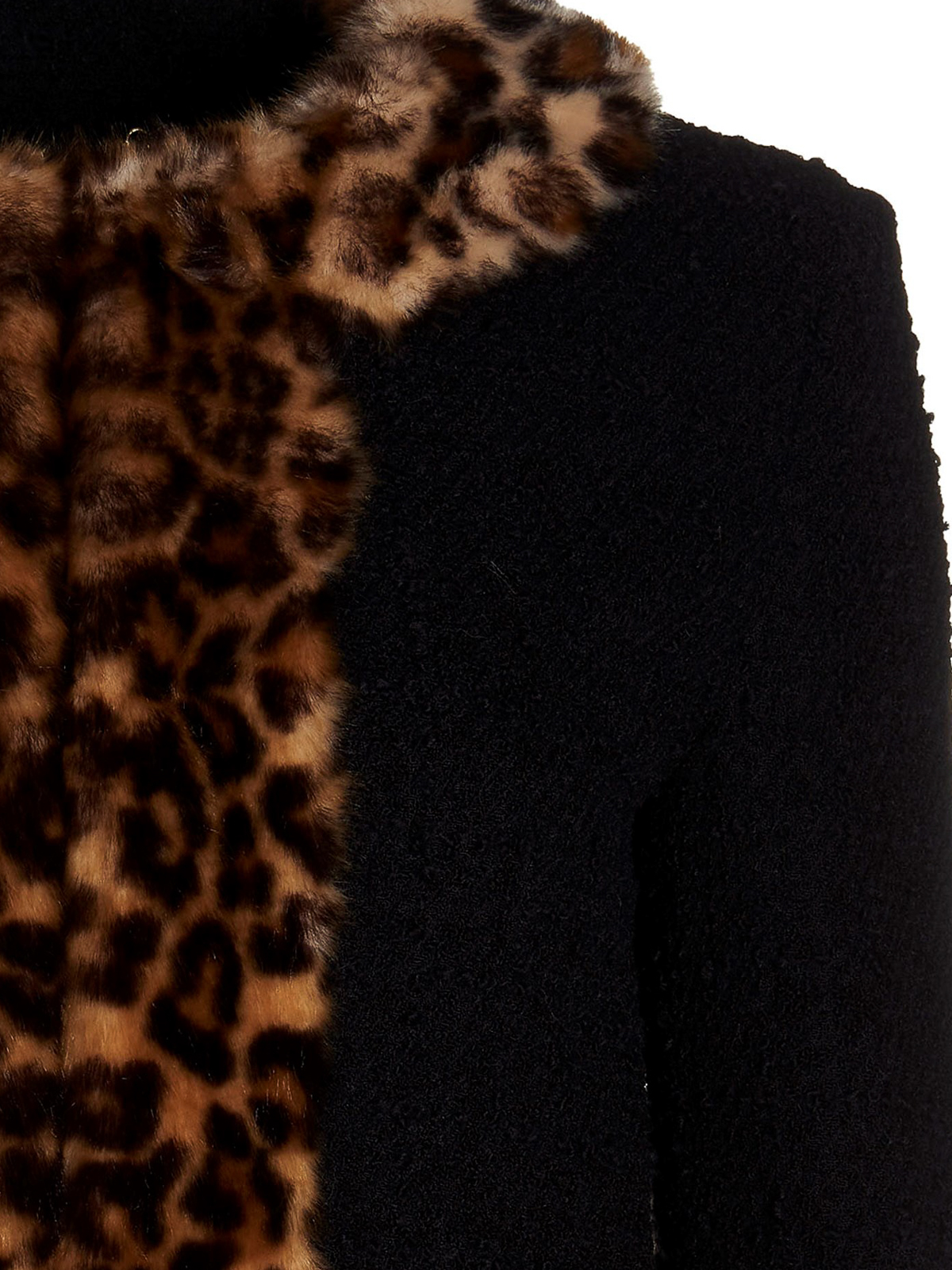 Bouclのウールブレザージャケットは、前後にアニマルプリントのフェイクファーのディテール、フックアンドアイクロージャーのビスコース裏地、クロップドフィットが特徴です