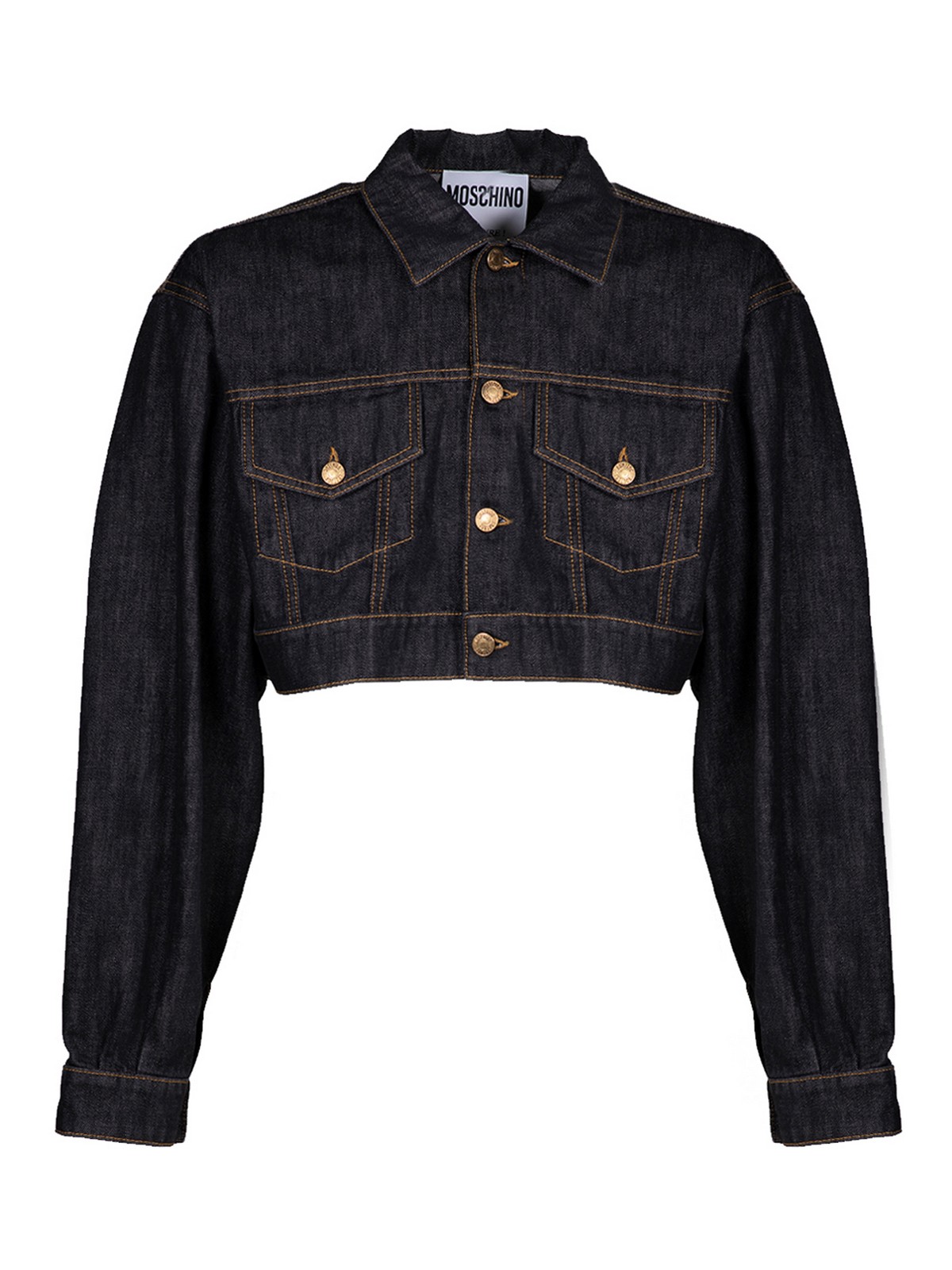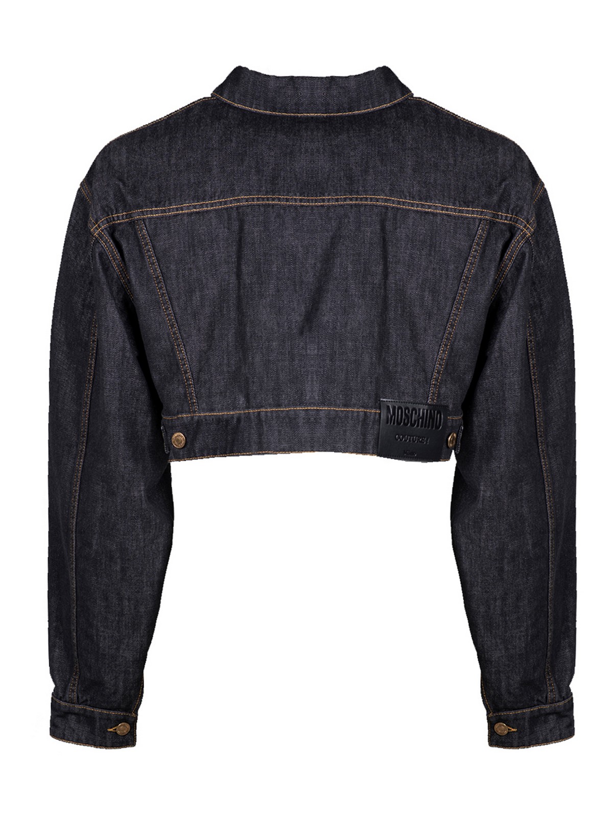 ブラックデニムのクロップドジャケットブラックデニムのクロップドジャケット前景にロゴが入ったメタルボタンが特徴のクロップドジャケットは、どんな服装にも贅沢なタッチを与えるクロップド、先のとがった襟、ダークウォッシュデニム 100% コットン