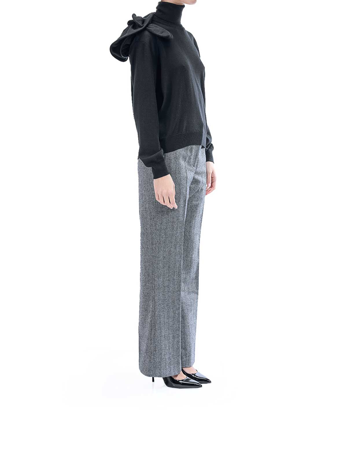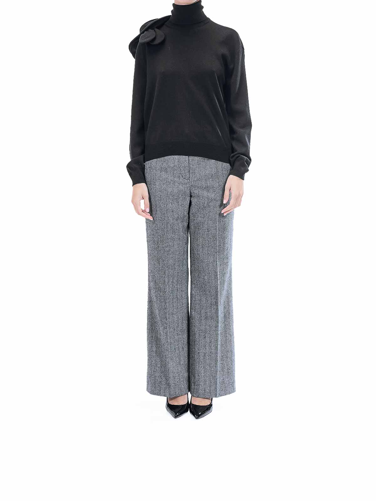 フラワープリントのタートルネックセーター。カラーはブラック。タートルネックで肩に花の形をした装飾が施された、Moschinoの極細メリノウールセーター。タートルネック、肩には花飾り、袖口と裾はリブ編み。カラー:ブラック。100% ウールフィット:レギュラーイタリア製。