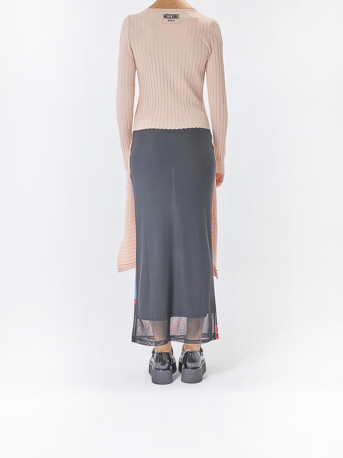 ピンクのフリンジ付きロングセーター。Moschinoのリブ編みセーター。クルーネックと裾がアシンメトリーで、サイドにフリンジのディテールがあしらわれています。ロングスリーブ、リブニット、クルーネック、アシンメトリーヘム、フリンジディテール。カラー:ピンク。83% ビスコース、17% ポリエステル。