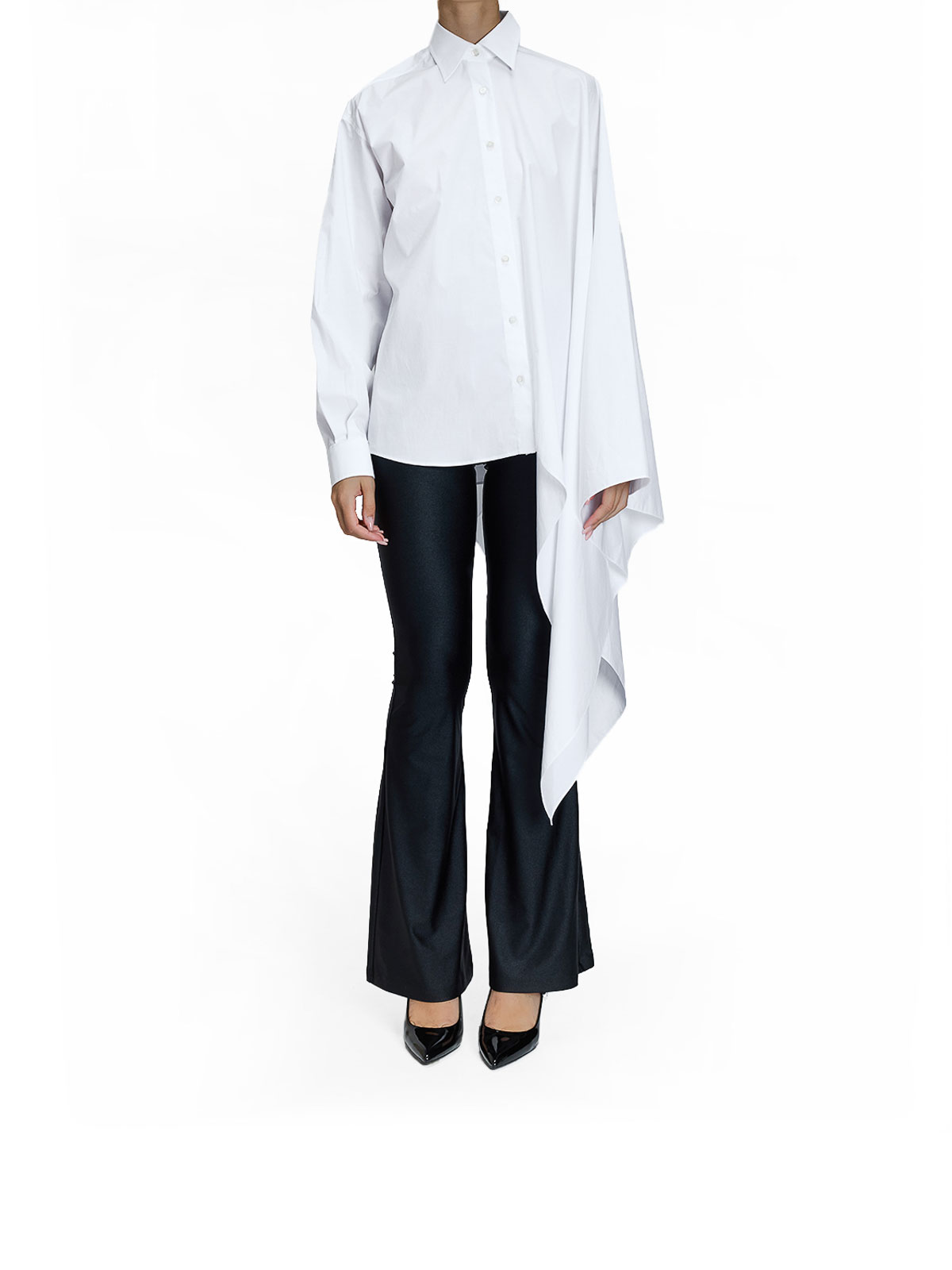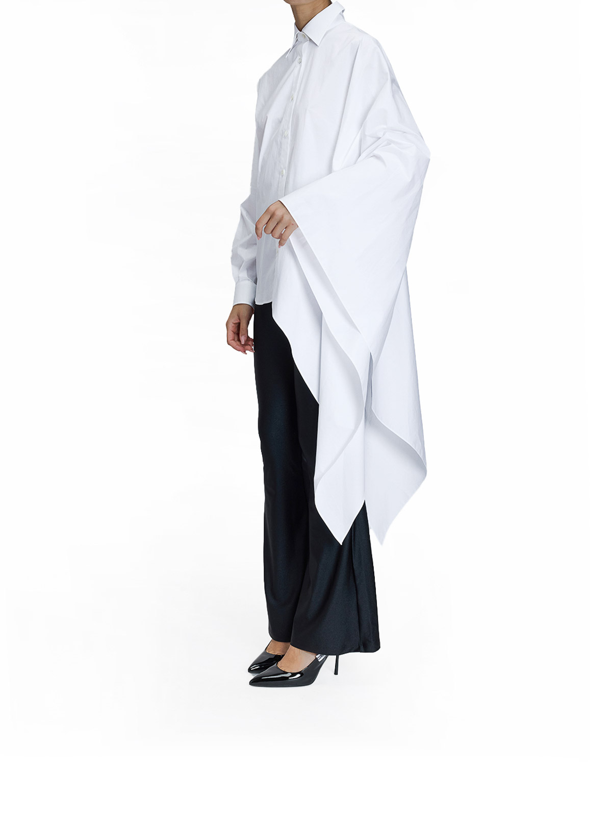 白いシャツ。アシンメトリーなデザインが特徴のMoschinoシャツ。ケープスリーブが1つ、カフス付きのクラシックスリーブが1つ付いています。クラシックカラー、フロントボタン、ケープスリーブ、カフス付きクラシックスリーブ。カラー:ホワイト。コットン 96%、エラステイン 4%イタリア製。