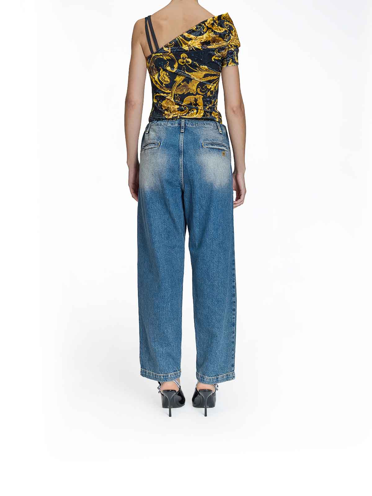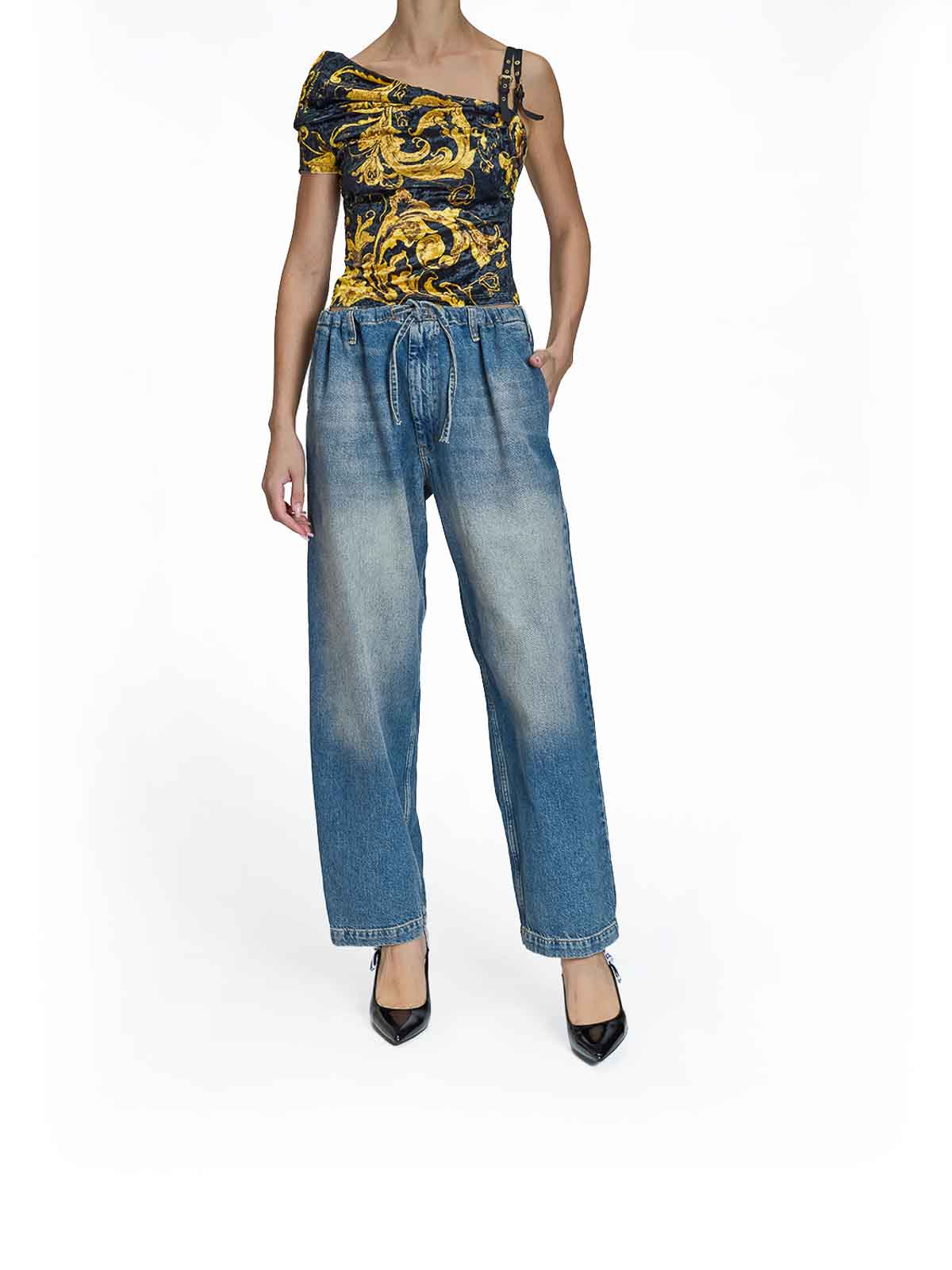 デニムのエイドリアンジーンズ。Moschino ルーズフィットデニムパンツ。ウエストはドローストリングで、後ろにはカーペンタースタイルのポケットが付いています。ルーズフィット、ローライズ、サイドポケット2つ、バックポケット2つ、メタルロゴボタン付きバックポケット、フロントジッパー、ドローストリングクロージャー。色:デニム。100% コットン。