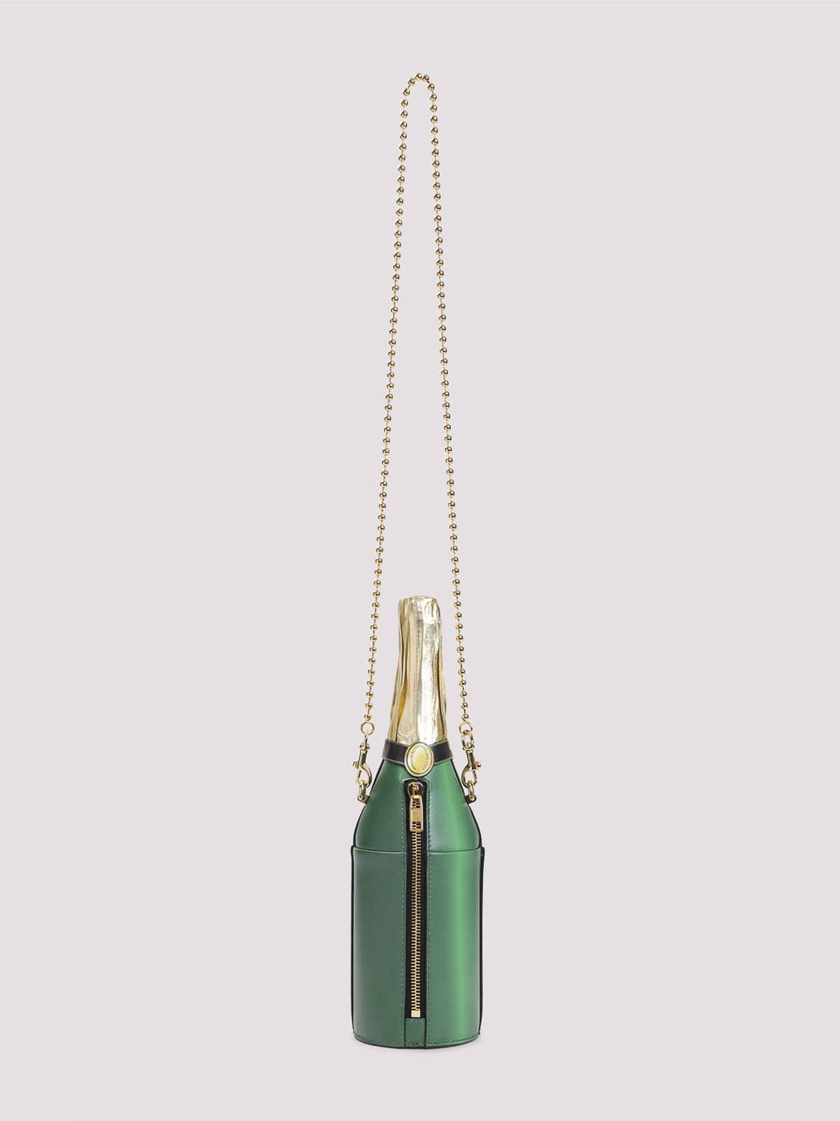 モスキーノボトルグリーンレザーショルダーバッグ。グリーンレザー製のボトル型ショルダーバッグ。前面にロゴ、背面にファスナー、取り付け可能なゴールドトーンのチェーンショルダーストラップが特徴です。