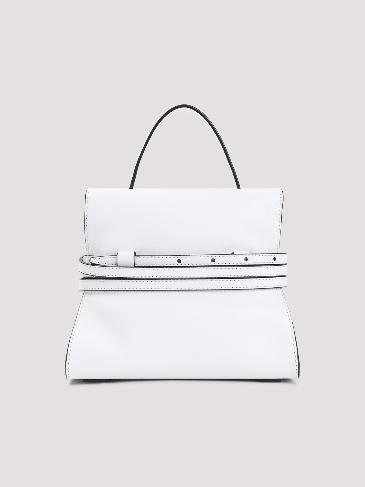 モスキーノホワイトレザーのショルダーバッグ。純白のナッパレザー製で、コントラストの効いたブラックのパイピング、ゴールドトーンのハードウェア、トップハンドル、エンボス加工のロゴが入ったフロントフラップ、隠しマグネット留め、バックルのディテールが施されたベルト、取り付け可能で調節可能なショルダーストラップ、内側のスリップポケット、総裏地が特徴です。