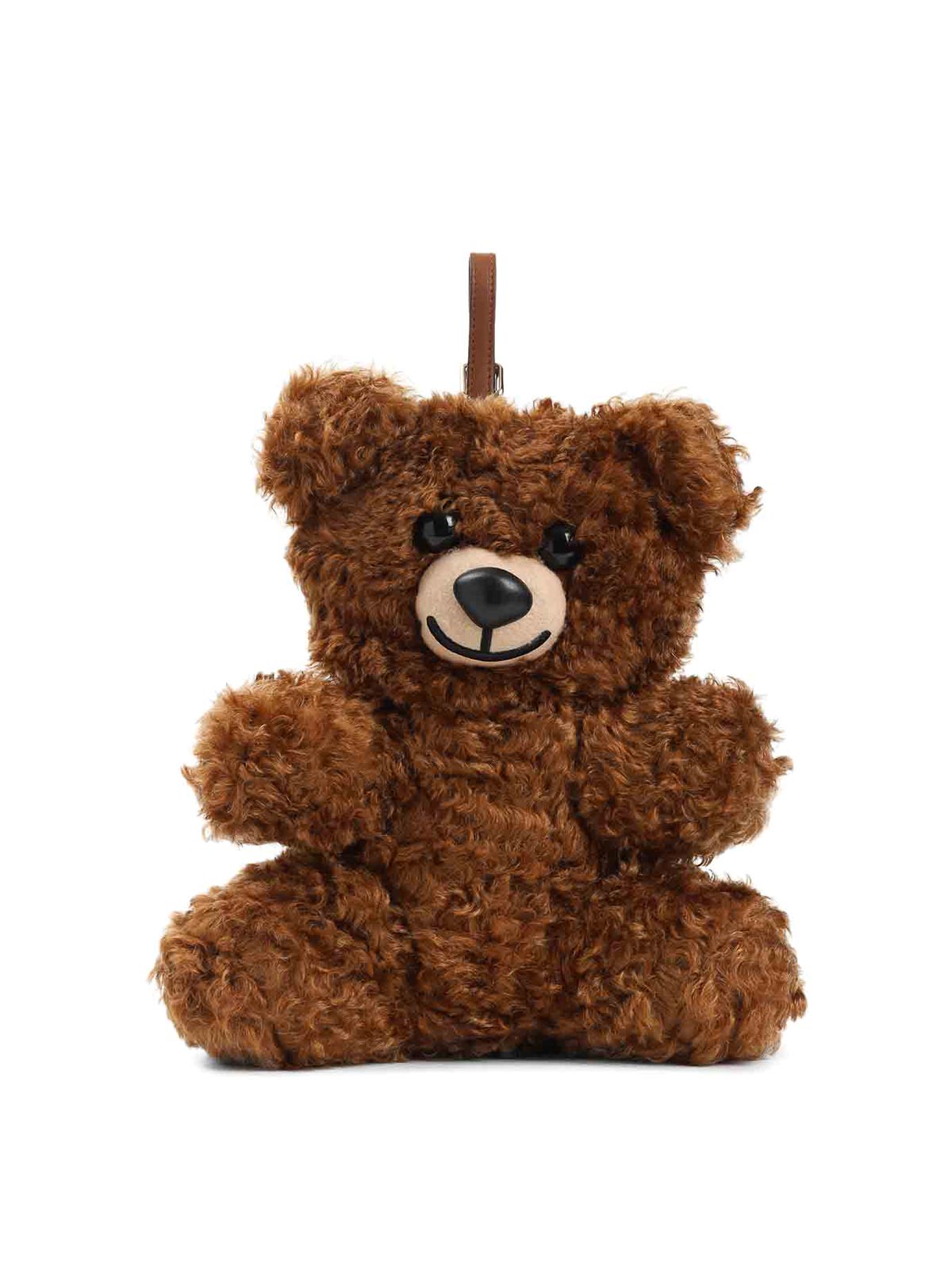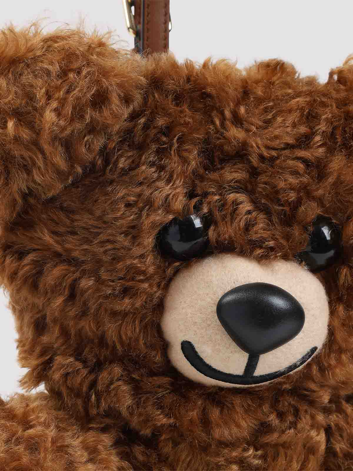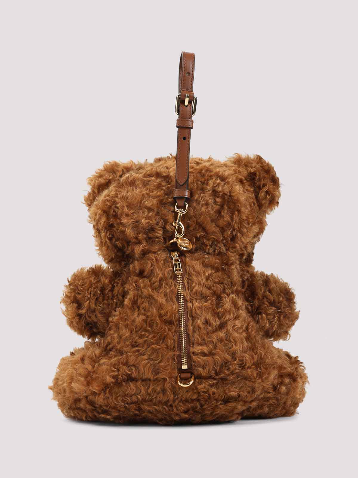 モスキーノベアブラウンモヘアショルダーバッグ。茶色のモヘアから作られたテディベア型のショルダーバッグ。ゴールドトーンの金具、取り外し可能なレザーハンドル、背面のファスナー、コットンの裏地が特徴です。