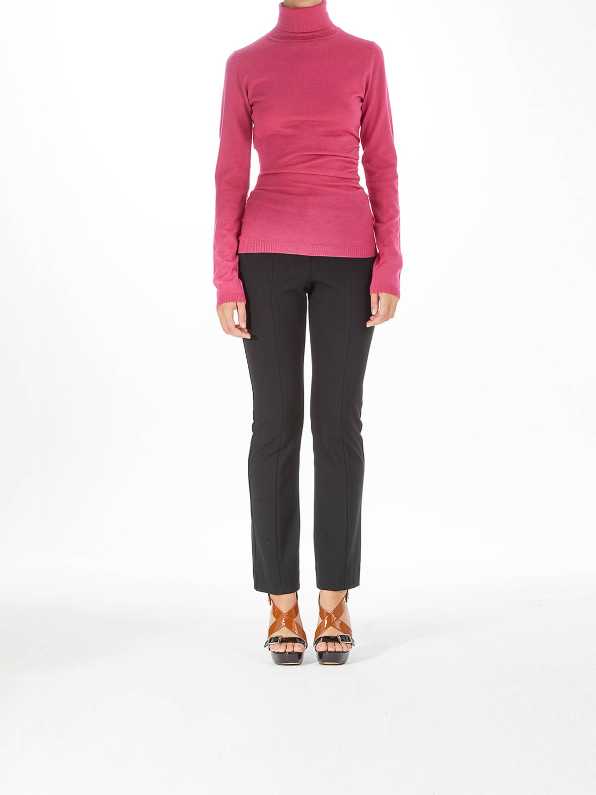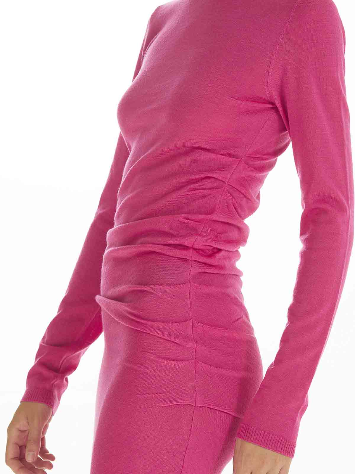 フクシア色のハイネックジャージーにピースロゴをあしらったドルチェヴィータ。背中にハートの形をしたピースロゴ、ヒップの横ドレーパーのハイカラー襟の脇に両サイドに伸縮性のあるラテラルドレープが特徴で、フクシアカラーのバックにハートの形をしたピースロゴの服