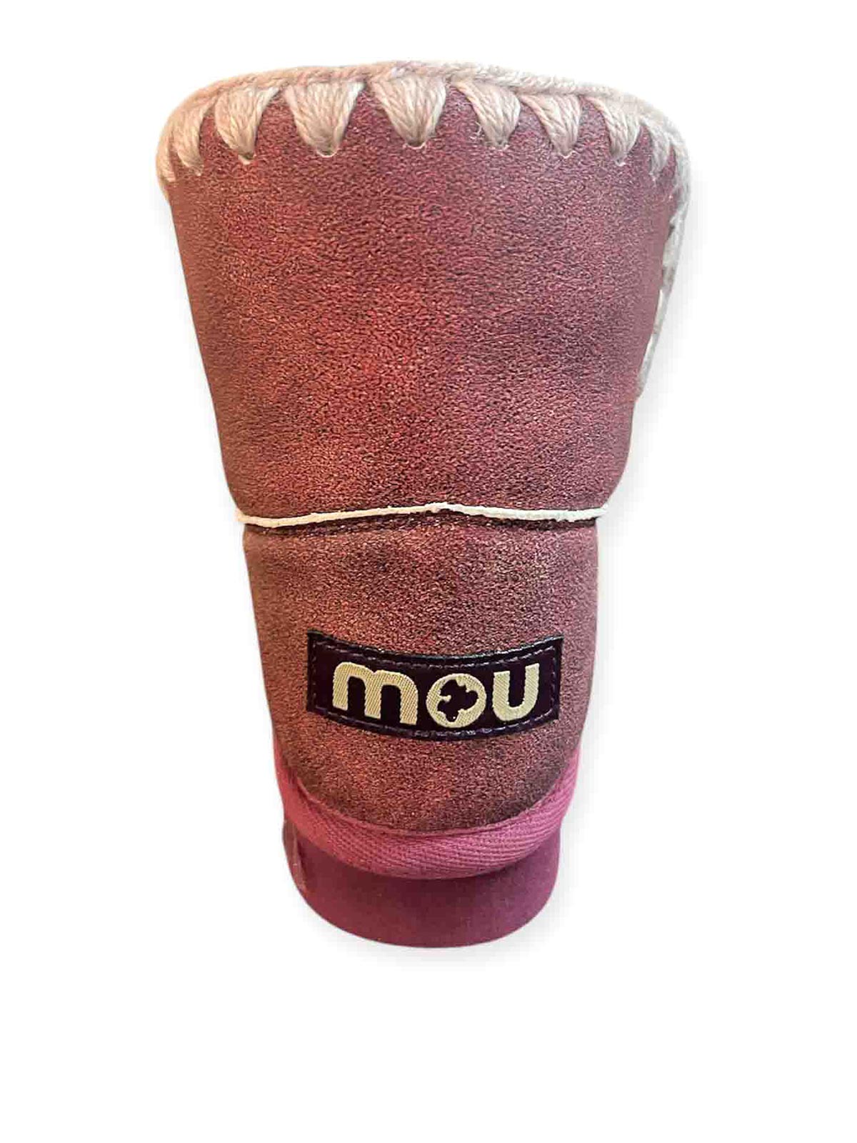 メタリック仕上げのバーガンディーエスキモー。本物のシープスキン2本で手作りされ、かぎ針編みのステッチでとても暖かみのある表面。