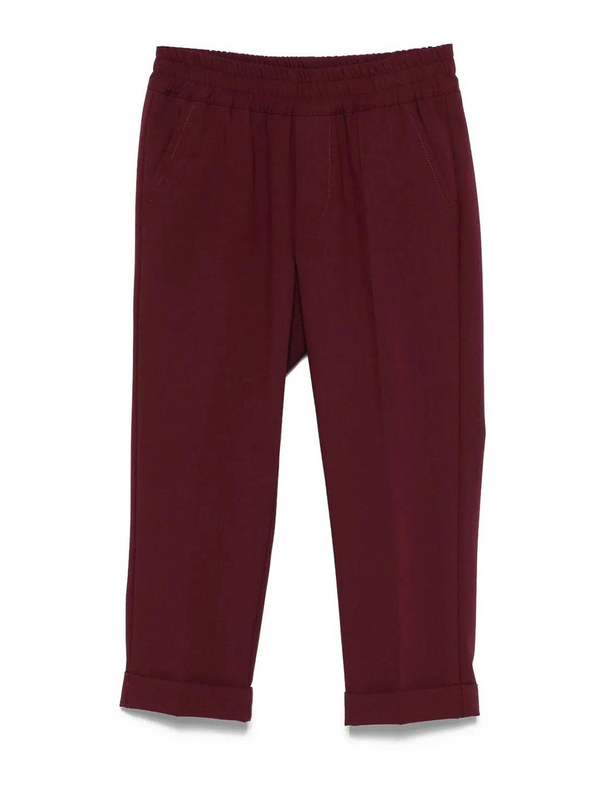バーガンディーのロゴ入りパンツ。ウエストはゴム入りで、下部にターンアップ付き。