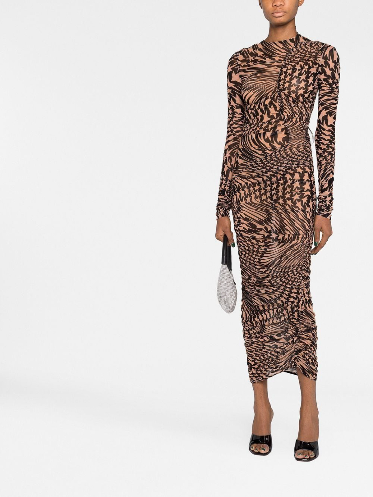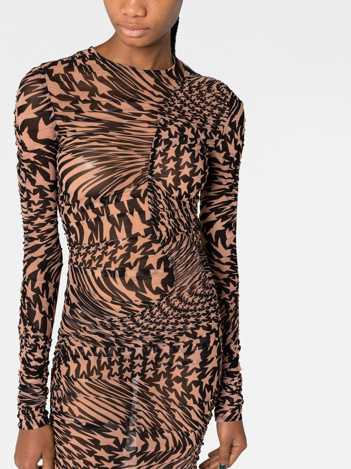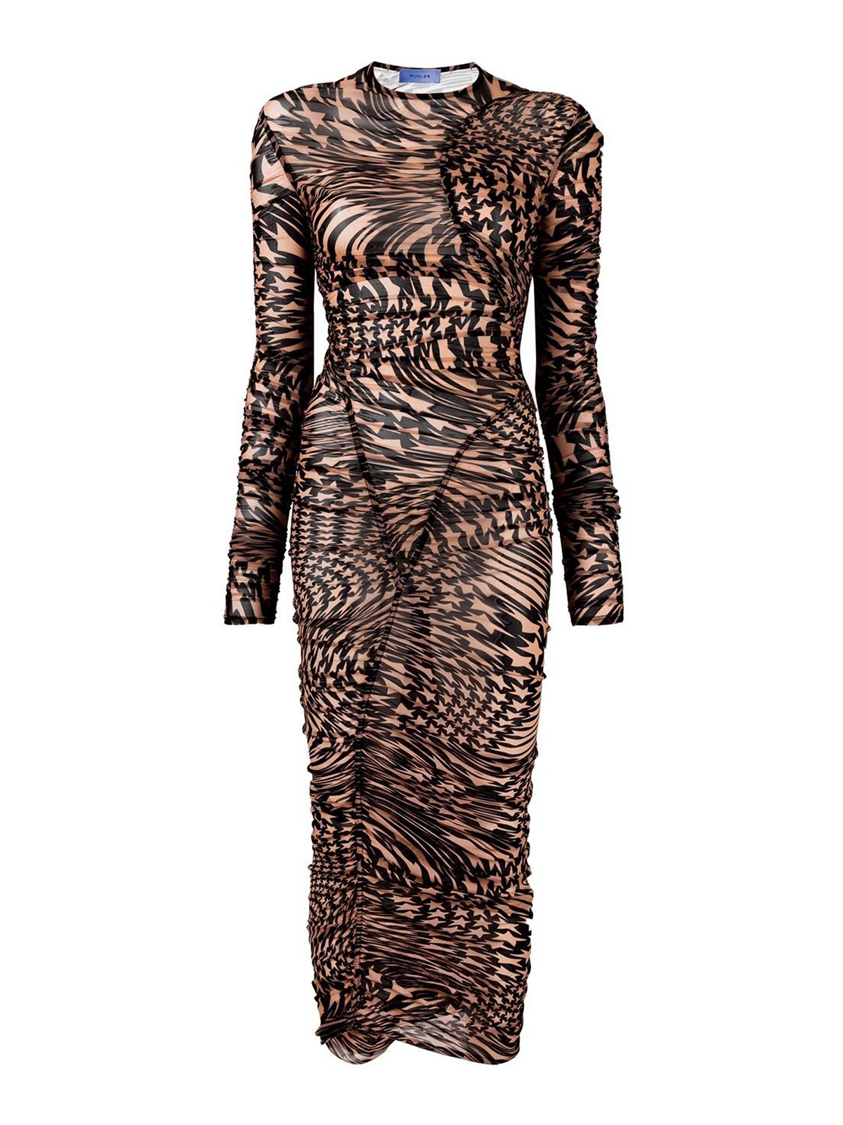 muglerのスタープリントのメッシュドレスは、ブラックベージュのスタープリントのラウンドネックロングスリーブ、ふくらはぎ丈とメッシュが特徴です。