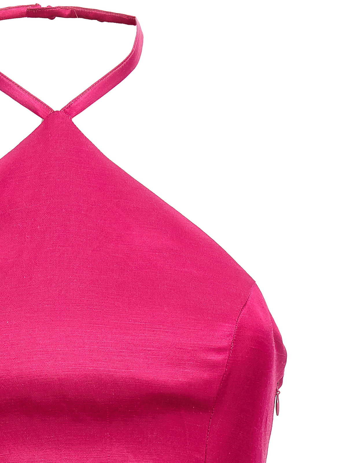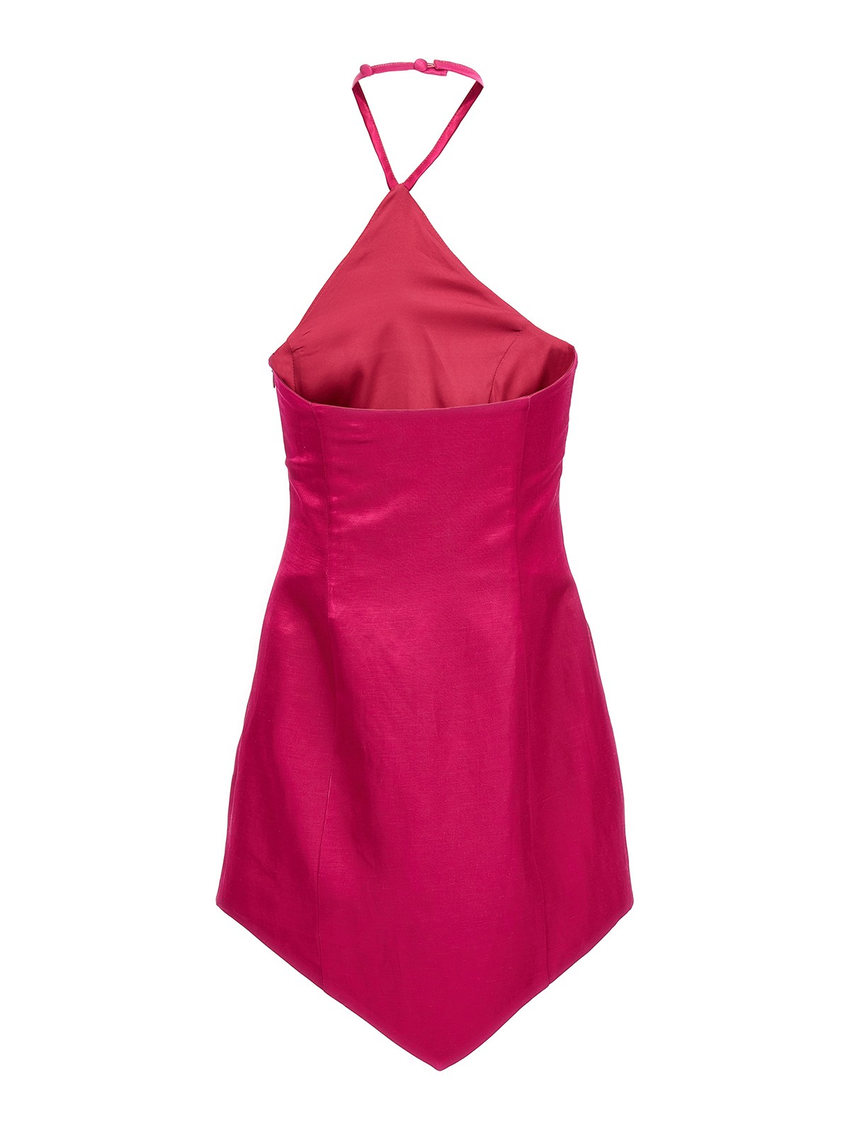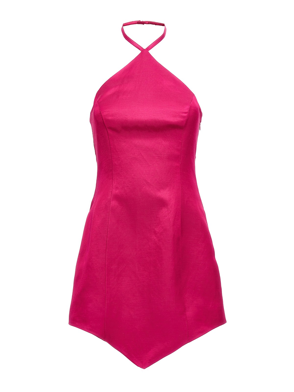 Catalinaのリネンとビスコースのショート丈ドレス。首回りに留め具、サイドジッパー付き、裾はアシンメトリーです。