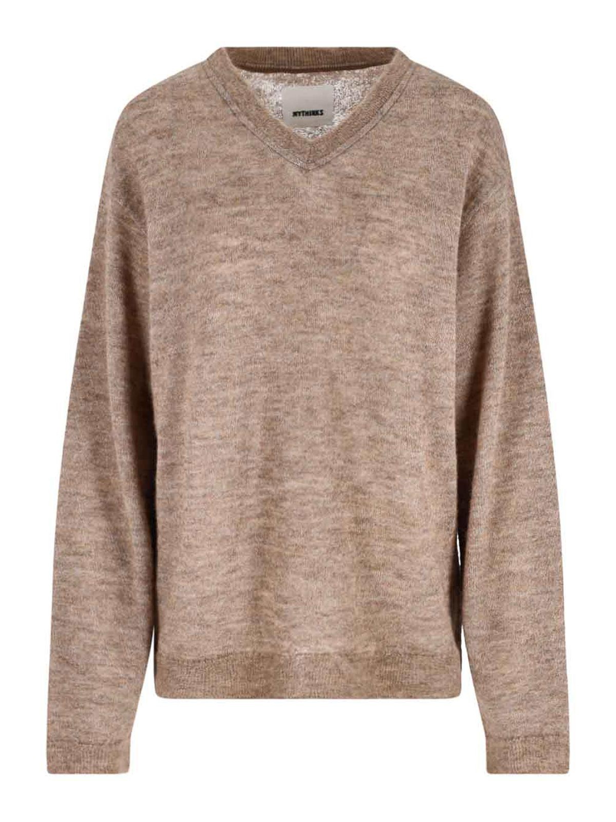 Mythinksアルパカ混紡セーター、ベージュ、Vネック、ロングスリーブ、ドロップショルダー、リブ仕上げ、ストレートヘム。