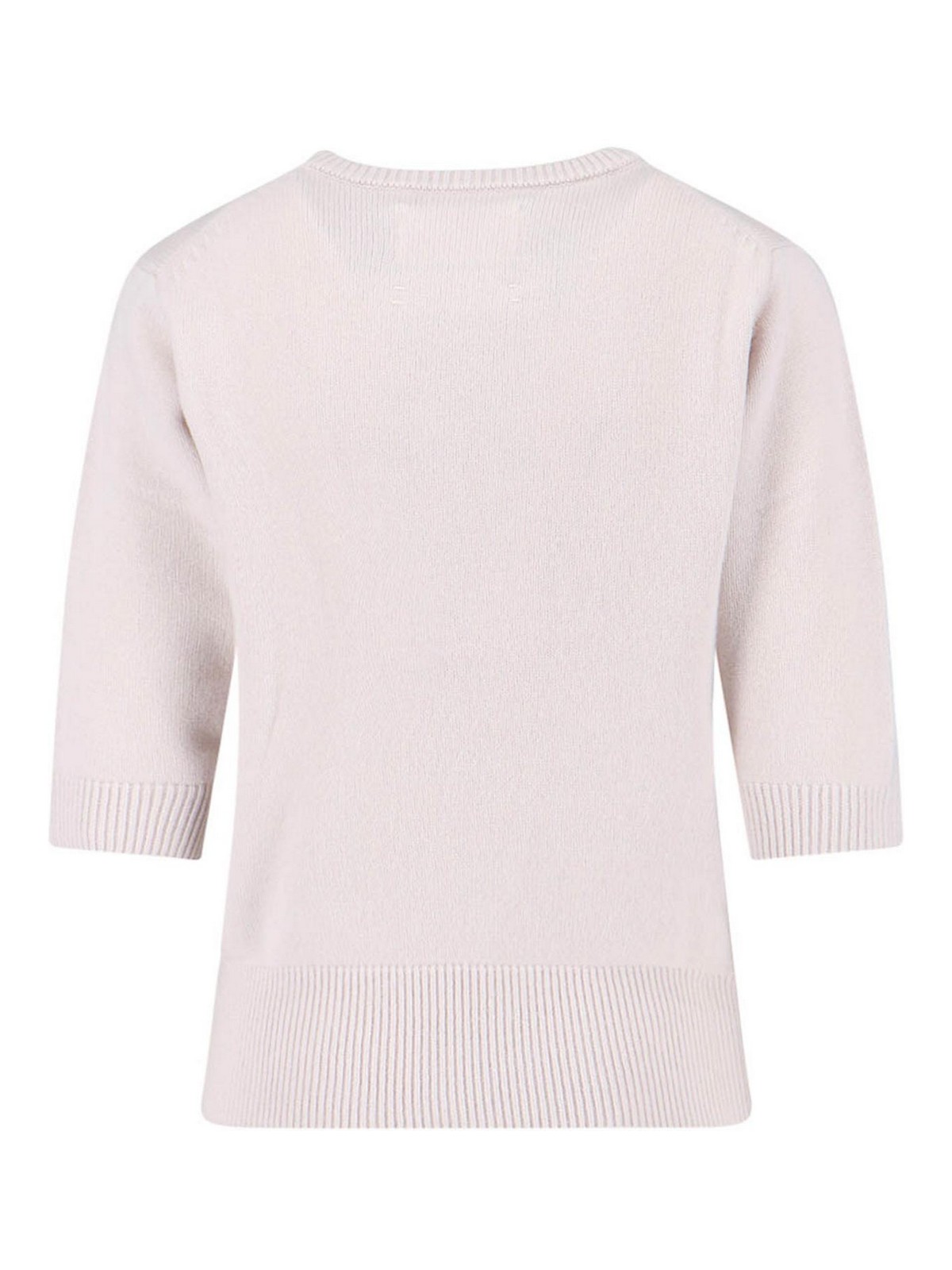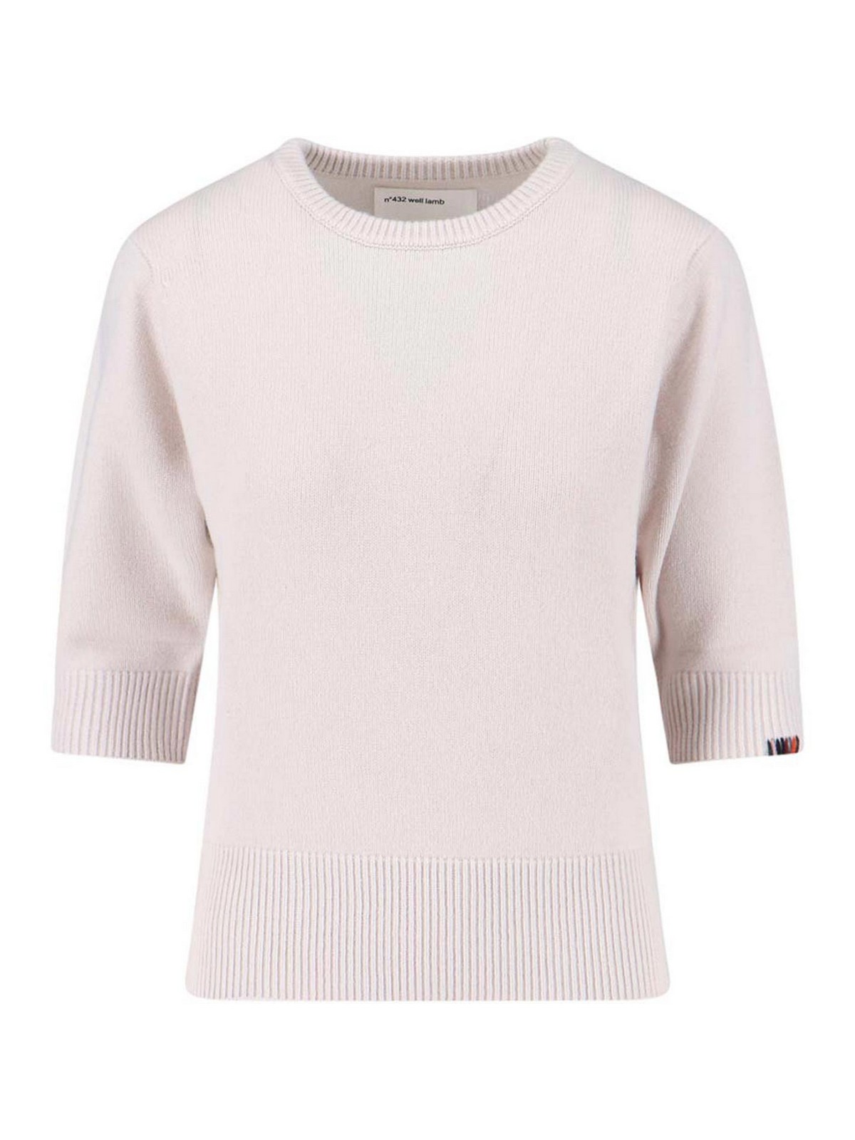 N432ウェルラムエクストリームカシミアセーター、クリームカシミア、クルーネック、七分袖、袖にマルチカラーのロゴ刺繍、リブ仕上げ、ストレートヘム。
