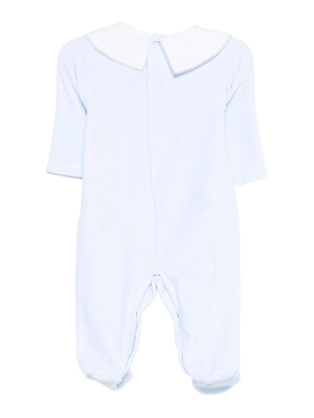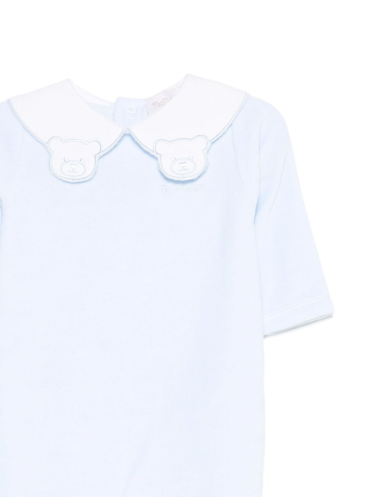 白い襟とテディベアのトリムが付いた新生児用シェニール織りのワンジー。背中と脚の間にボタンが付いています。