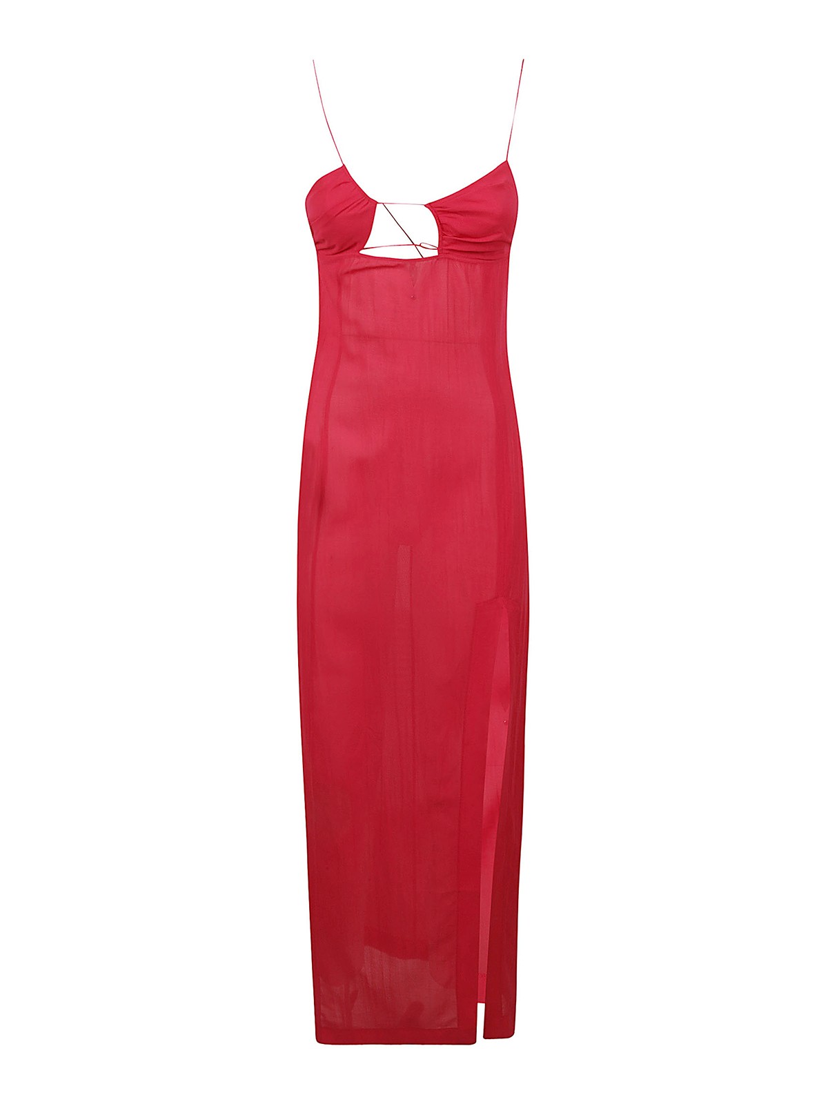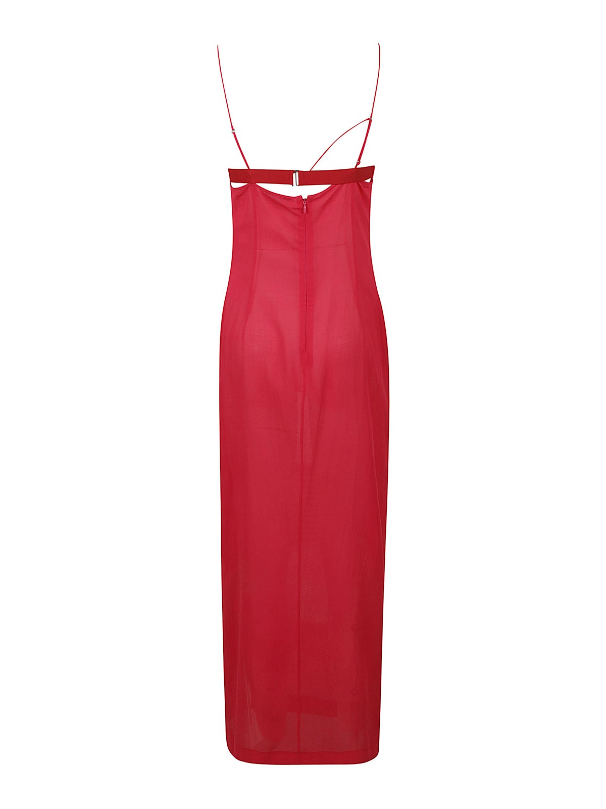 半透明デザインの細いストラップ、深いVネック、フロントにカット