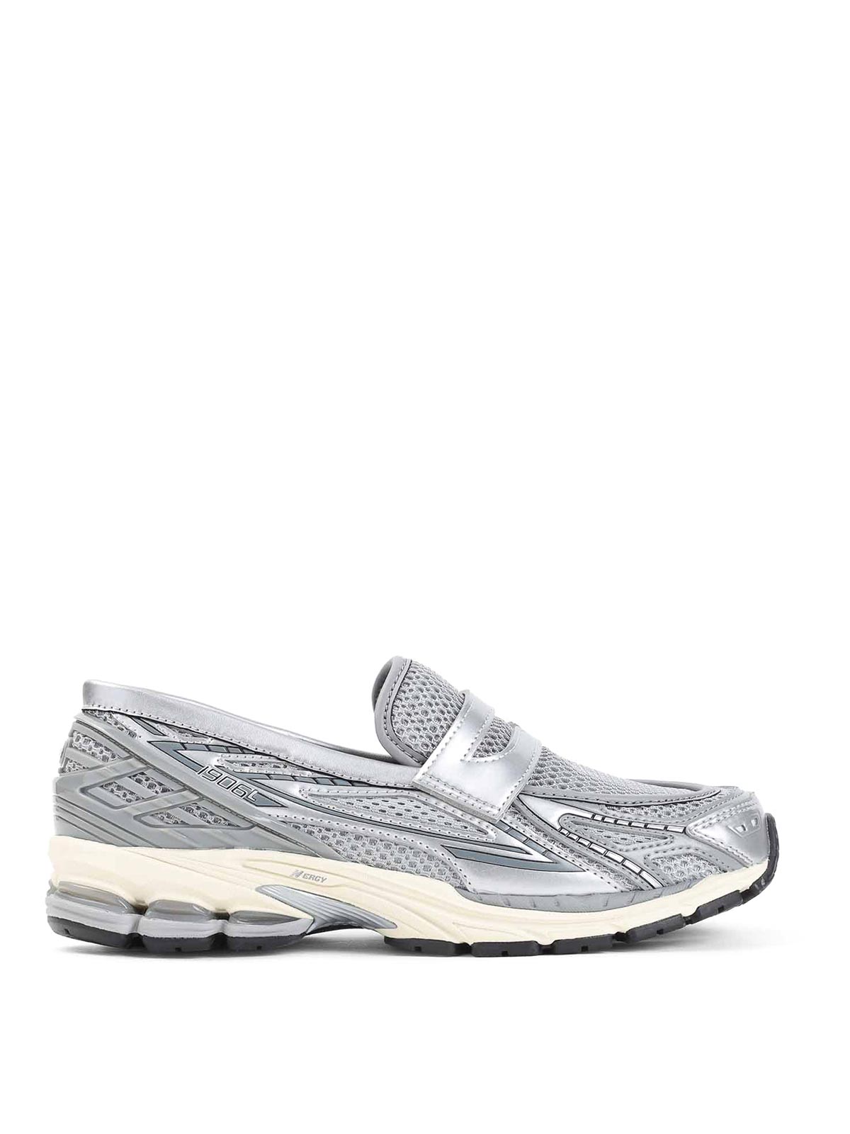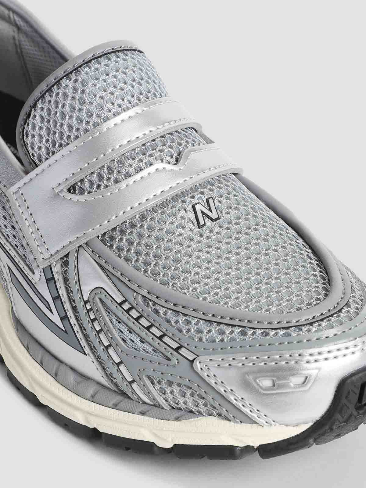 ニューバランスローファーシルバーテキスタイルスニーカー。グレーのメッシュにシルバーのインサートが入ったローファーデザインスニーカー。丸いつま先、上部にシルバーのペニーストラップ、パッド入りの裏地、ブランドインソール、ランニングラバーアウトソールが特徴です。